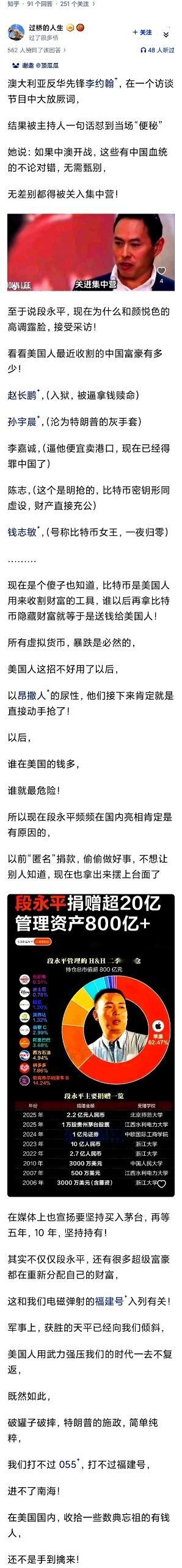 2025年11月中旬,段永平为啥突然高调露脸?有网友说,东西大国矛盾逐渐加深,直到不可调和,这是个趋势,段不会看不出来,目前他的主要投资押注在美股,一旦需要选边站队,他在西大是孤独的,也是危险的,华人在美的经济利益面临收割,他必须要转移一部分资产回到国内,以防不测。下一步他会进一步增加露脸机会,在国内投资实业,增加教育科研慈善事业投入,多为国家做积极有益的事情,最终需要选边的时候,他要回来的…感觉这个说法靠谱。段再有钱也不过是人家数据库里的一条记录,改一下 owner 就不是你的了,号称匿名的比特币不一样被没收。比如赵长鹏就为在美富豪打了个非常好的样儿,美国治理这些外来富豪就是简单粗暴,直接抓监狱,打钱!看着欧美在大肆收割华人资产,段心里也会慌的…其实段是个比较拧巴的人,就是像他的网名,大道无形我有型,既推崇大道无形,又强调自己的型,既不想让人觉得他高调,其实也不甘于低调。一方面自己享受在雪球被网友吹捧,一方面以对网友怼了受不了要声明退网,没几天又高调接受方丈采访,嘴上不在乎,身体很诚实。他移民美国应该有快二十年了吧,他是那个时代企业家中做的很顶尖的,但实际上他又错过了中国最精彩一个时代了,如今看到中国目前的现状,心情其实是蛮复杂的,他不缺钱,心愿就是太想当个完人了,越如此越拧巴。