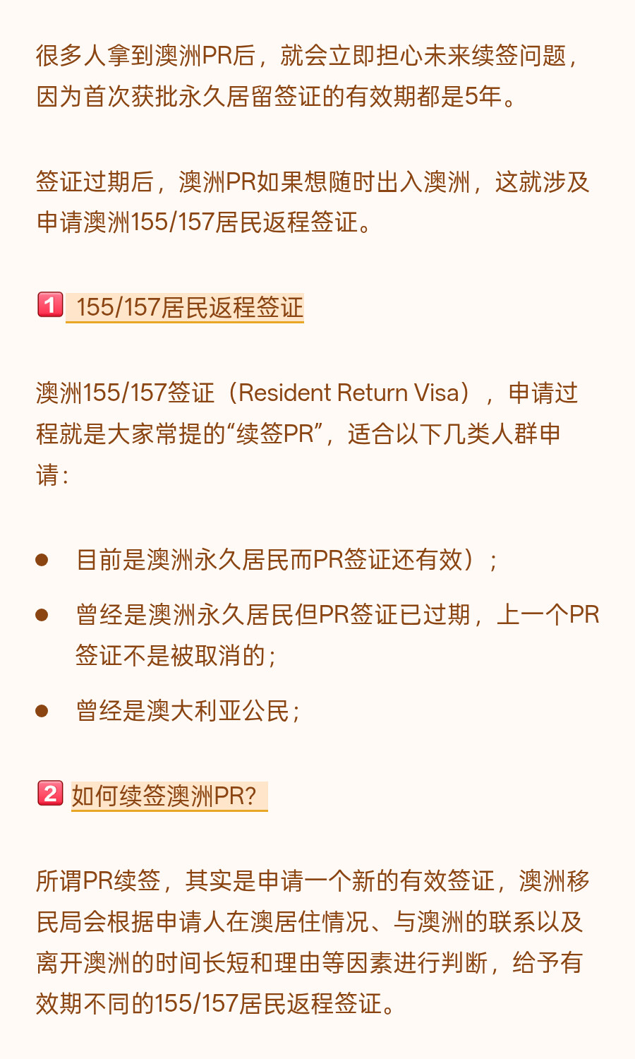 🔍 155/157签证是什么?谁能申? 不想放弃中国国籍,又想自由往返澳洲的朋友就需要通过155/157签证进行 “PR 续签”,主要适合这三类人: ✅ 目前持有PR签证(签证还没过期) ✅ 曾经持有 PR签证(过期了但没被取消) ✅ 曾经是澳洲公民;
