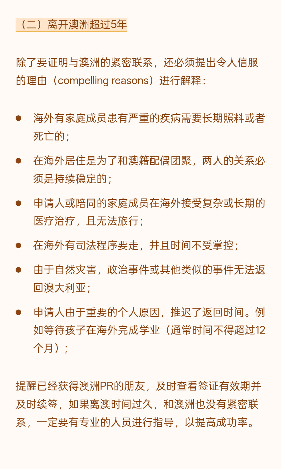 -- 5年住满2年:直接拿5年155签,超省心! -- 5年住不满2年但至少1天:只要能证明和澳洲有 “实质性联系”,能拿1年155签 ; -- 离澳超5年:除了证明联系,还要给 “令人信服的理由”(比如照顾重病家人、疫情影响),也能拿1年签 ; -- 以上都不满足:有机会拿3个月157签;
