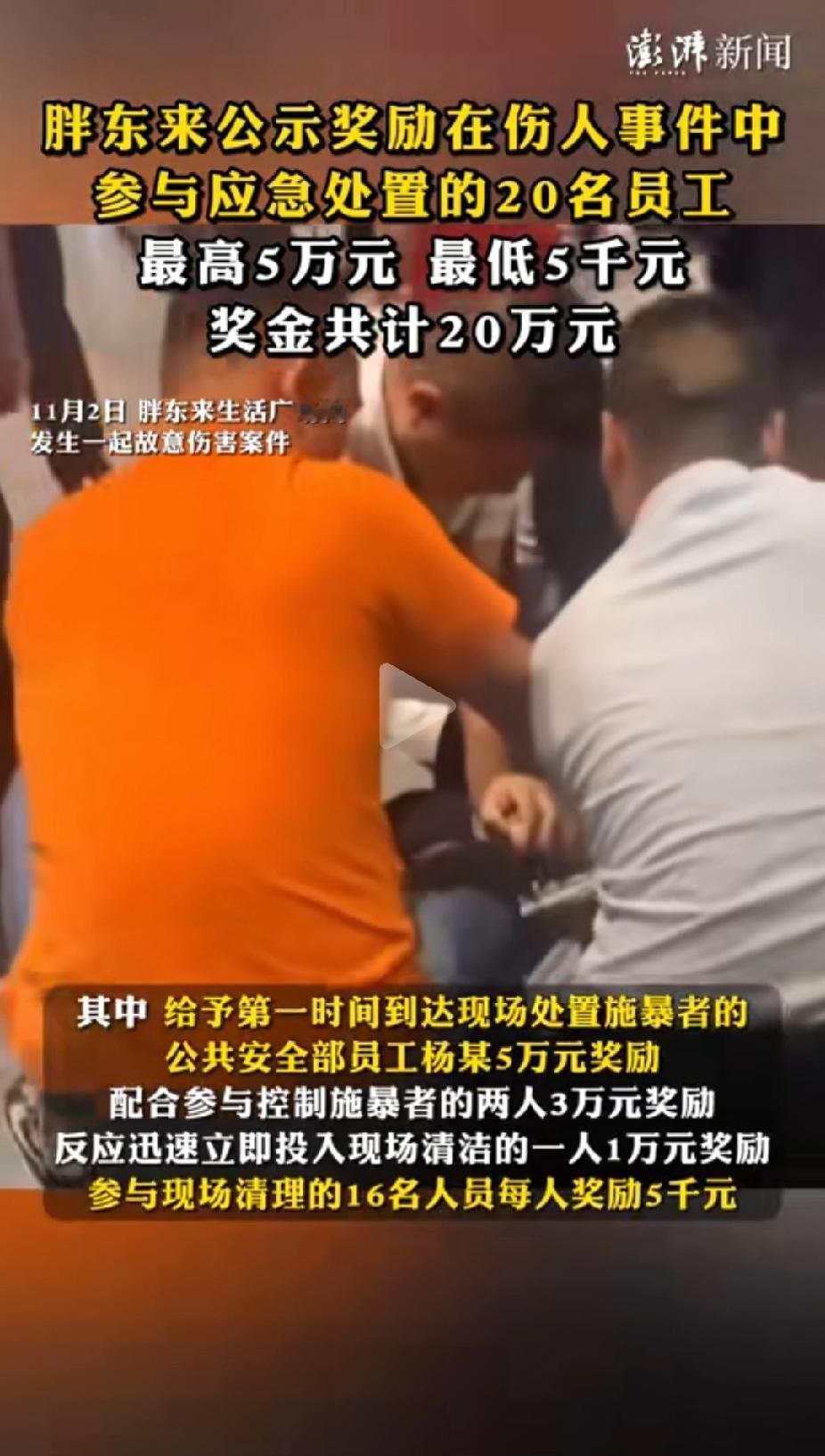 重赏之下必有勇夫!胖东来重奖参与制止暴力事件员工,一人直接制服歹徒奖励5万元,从旁配合的两人奖励3万元,第一时间现场清洁的一人奖励1万。另外参与现场清理的16名人员每人奖励5千元。 当然也会有杠精说:不是第一时间制止犯罪分子么?怎么还有人受伤呢?胖东来发生的这次突发事件我也发声了,可惜这篇小文章沉了,但是众多评论里这个杠精让我忍不了就回怼了他一通。 我回复他:牙齿和舌头都长在你脑袋上,怎么有时候牙齿还会咬到舌头呢?你那脑袋干啥用的?不知道第一时间制止牙齿别咬舌头么? 胖东来保安防守再严密,武功再怎么高强,也防止不了突发事件发生呀,只能在犯罪发生后尽快制服罪犯,把伤害范围和程度降到最低,这就是尽职尽责了。胖东来的保安又不是贴身保镖,怎么可能做到对每个人都能第一时间防护无死角呢?看看前些年委内瑞拉总统马杜罗阅兵遭遇无人机袭击,他那些贴身保镖都干啥了?有的不也吓得趴下了?[笑哭] 如今这年头老板善待员工的唯一标准就是发钱,灌鸡汤画饼都是白扯蛋。