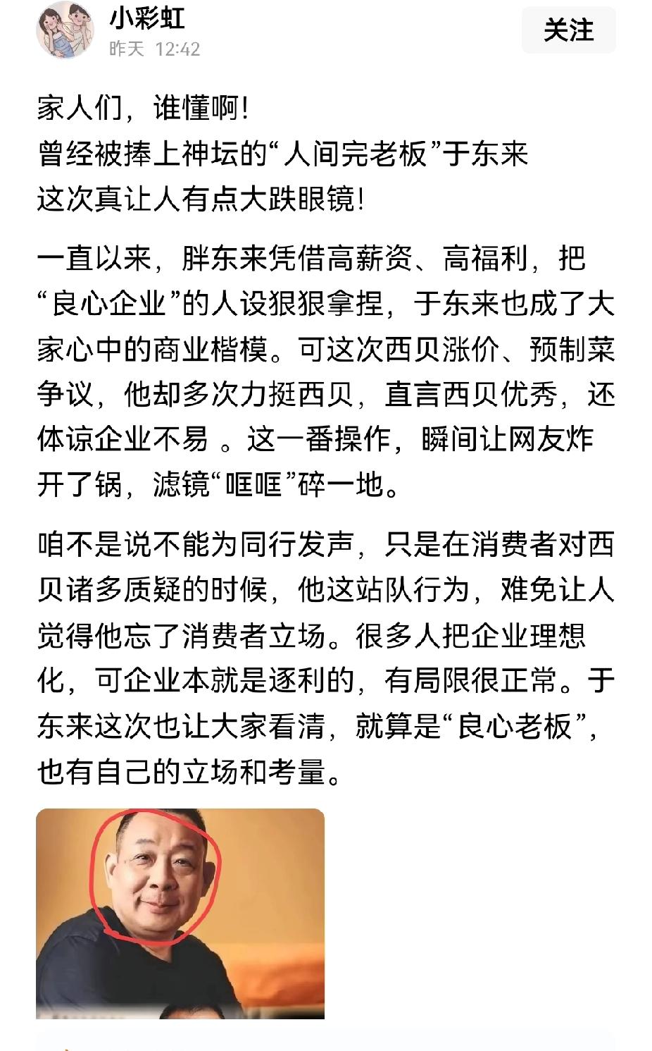 老罗太嚣张了,竟然用江湖大哥口吻喊话于东来不要趟浑水,于东来说错了吗?企业犯错了,难道不是让他改正,而是墙倒众人推让他死么? 广大网友还不接受教训么?想当初是怎么一窝蜂的抬高娃哈哈,狂贬农夫山泉的?最后的事实咋样?娃哈哈真的爱国?农夫山泉真的不好?这样被打脸的事数不胜数,咋就不记事呢?人云亦云,都没有点自己的独立思想么? 为什么于东来就是说了几句公道话,咋就成了被攻击对象呢?不外乎有些平时就恨于东来的一些人,每当社会负面新闻出现并且闹大时,想方设法也要扯上于东来,这样他们攻击于东来就有说辞了,而且这些人在网络里也是很有实力,能够带动舆论导向。 西贝倒了,你们这些攻击者,你们有啥利益可得?丧失多少就业岗位,丧失多少税收,谁顶上?是你们这些攻击者么?一个企业壮大不容易,有错了,咱们帮他改正错误,而不是一味的放大错误去整死他。 有人说西贝倒下了,还会有别的企业顶上来,这话我信,但这是不是一种浪费呢?经济繁荣非要倒闭一家,新起来一家才能行么?就不能共荣共生么? 于东来本来就是一个劝架的,现在反而成了那些有心人转移火力的目标,这个世界真的要被民粹绑架了么?可悲可叹! 至于说于东来关闭隐藏账号,说什么他要翻车了。哎呦呦,这种口吻多么熟悉呀?像不像西方经济学家年年预测中国经济大崩溃,预测了几十年了,如今咋样了?中国都是世界第二大经济体了。所以说,无论网上这波人怎么攻击于东来,也无法撼动人家是成功的企业家,整个河南省就是于东来的坚强后盾,只要许昌城还在发展,于东来这块金字招牌他就永远不会倒,他不是弱不禁风的泡沫网红经济,他是实体经济,这就是底气!