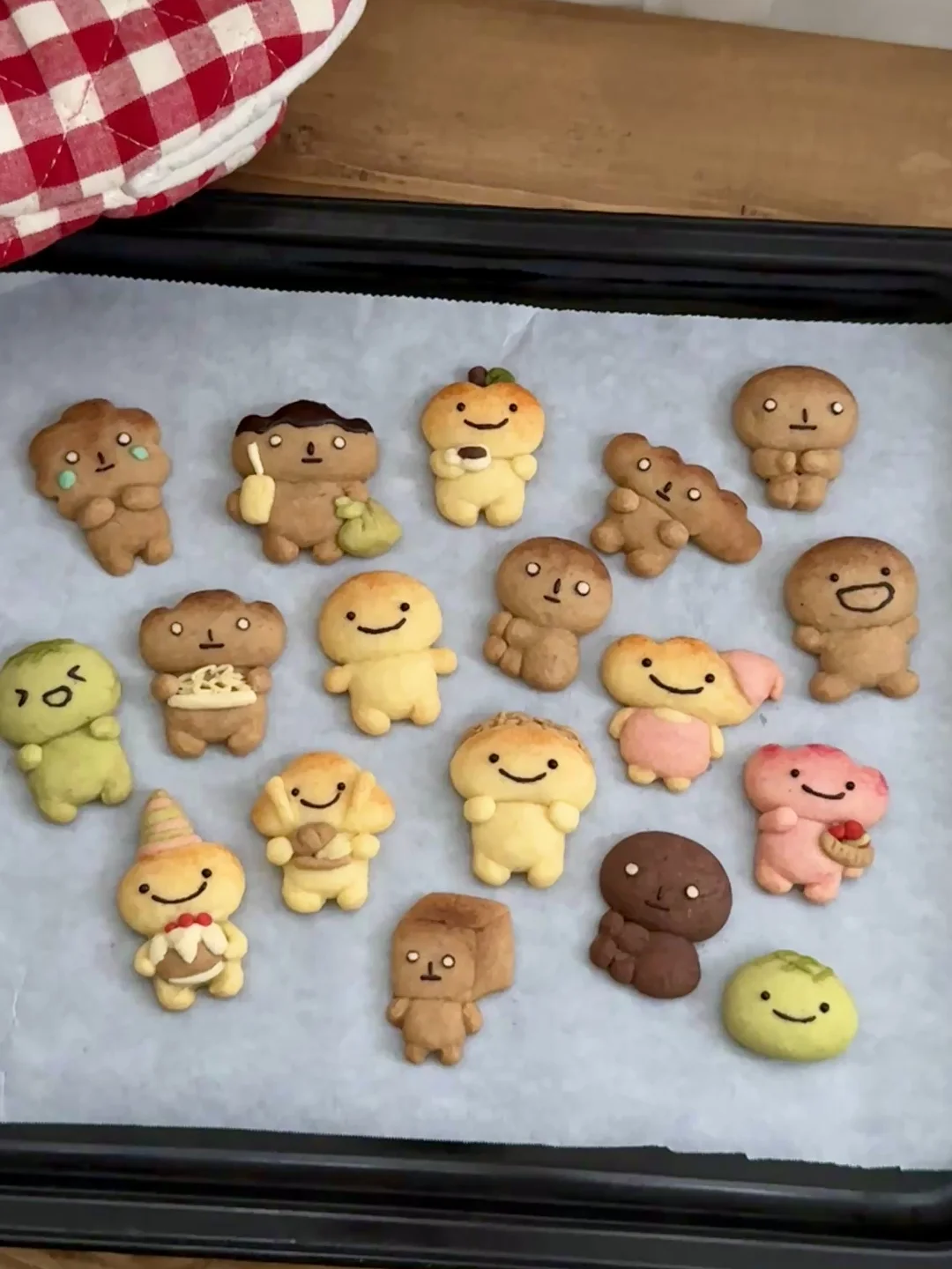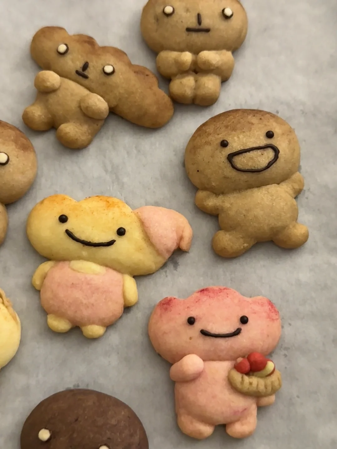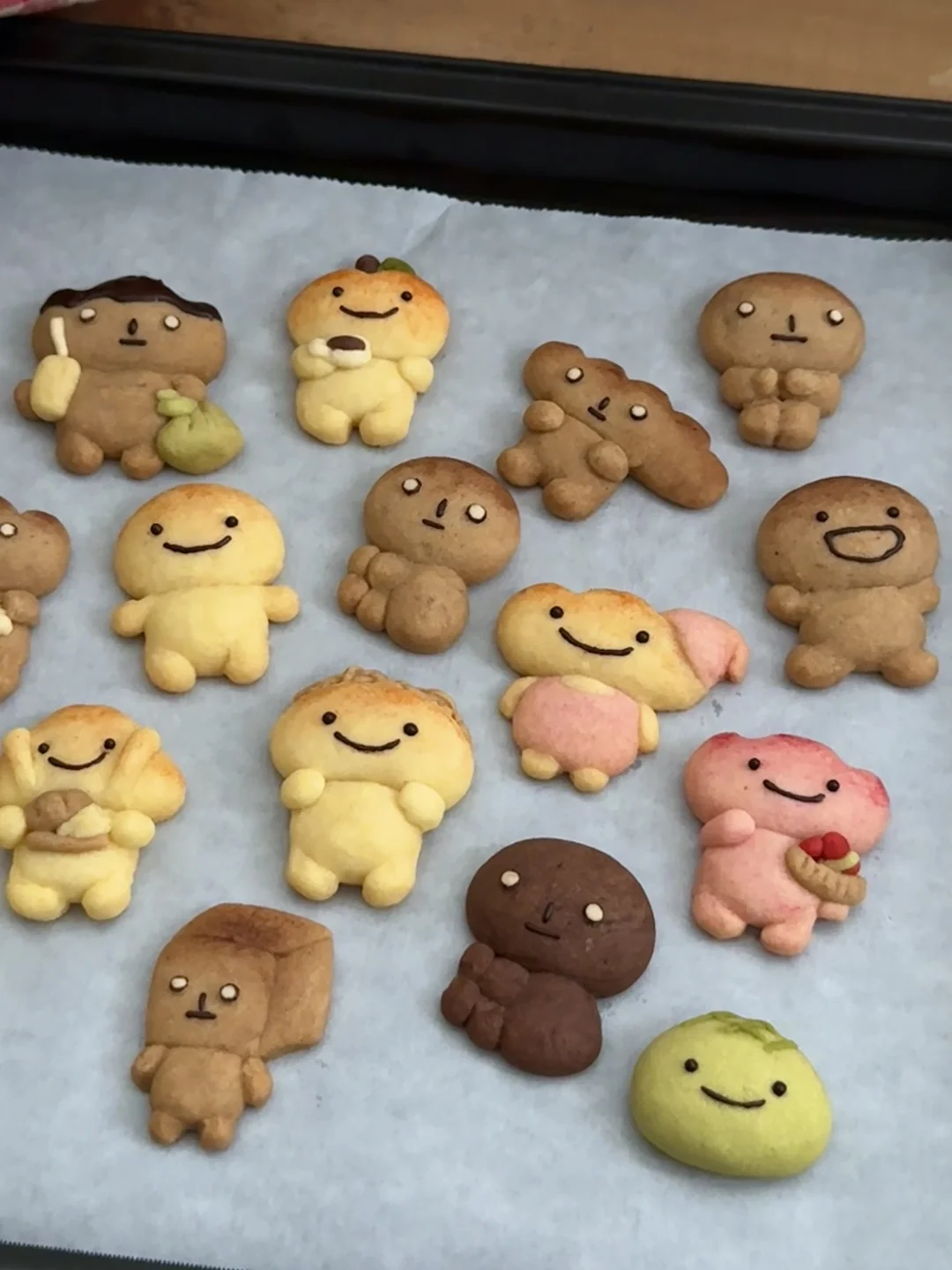 做不了漂亮面包也没有关系呀 总会有人喜欢烤焦面包的🤎 今天是一盘很治愈的萌物曲奇~ - 材料:软化的黄油100g、糖粉40g、低筋面粉180g、常温全蛋液25g 步骤: 1️⃣黄油室温软化,加入糖粉和面粉混合搅拌均匀,分批加入蛋液,混合搅拌成团 2️⃣将面团调好不同颜色的面团,包上保鲜膜放冰箱冷藏松弛15分钟 3️⃣将面团捏成不同造型的烤焦面包,做好的曲奇送入冰箱冷藏2小时或隔夜 4️⃣烤箱150度预热,送入烤箱烘烤25分钟(可根据曲奇的大小调整时间),烘烤8分钟后盖上锡纸,烤好的曲奇晾凉后用巧克力酱画上表情就好啦