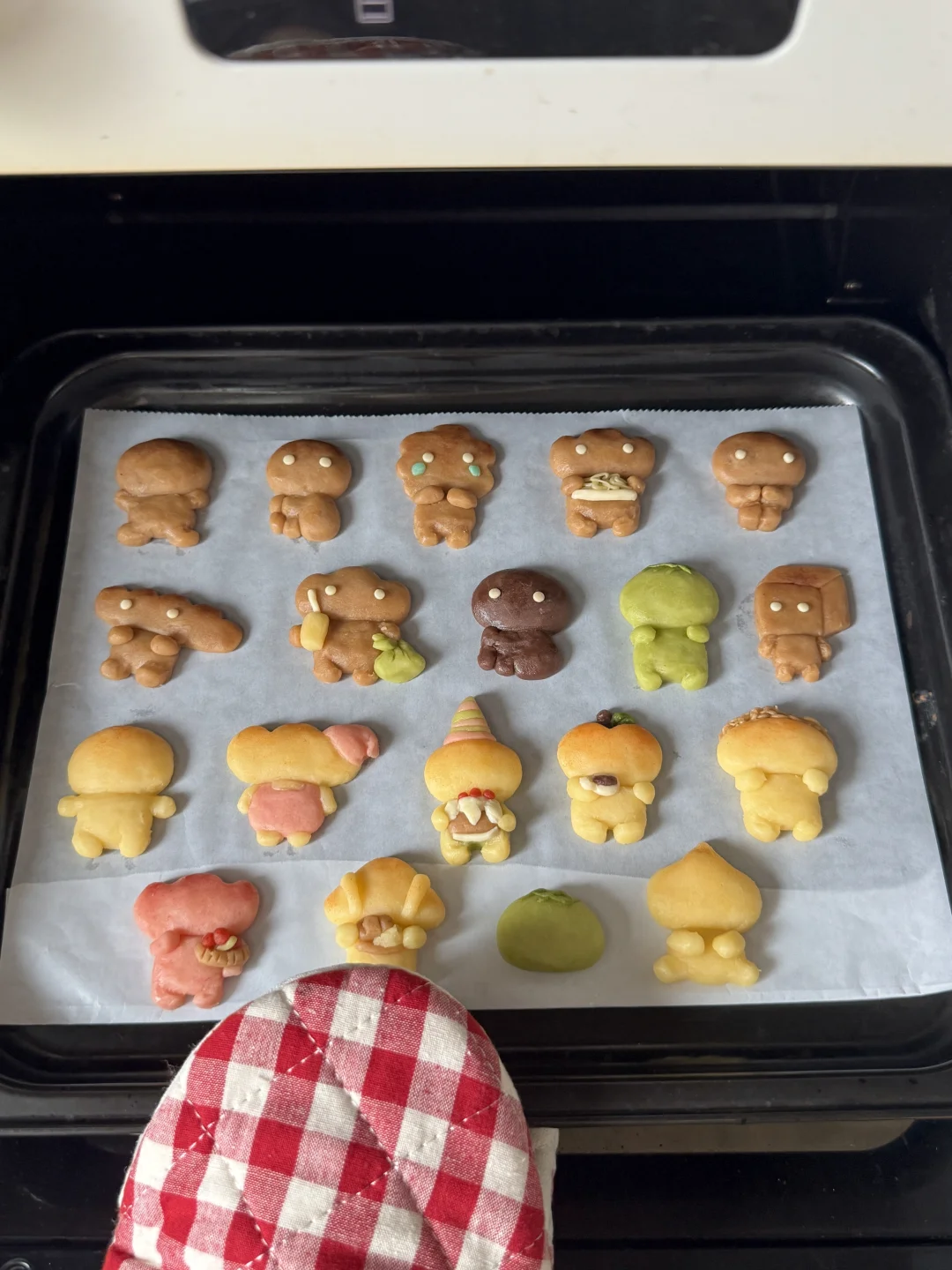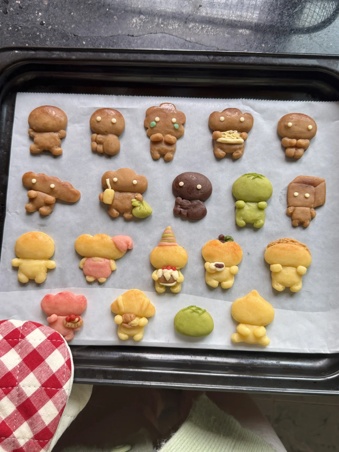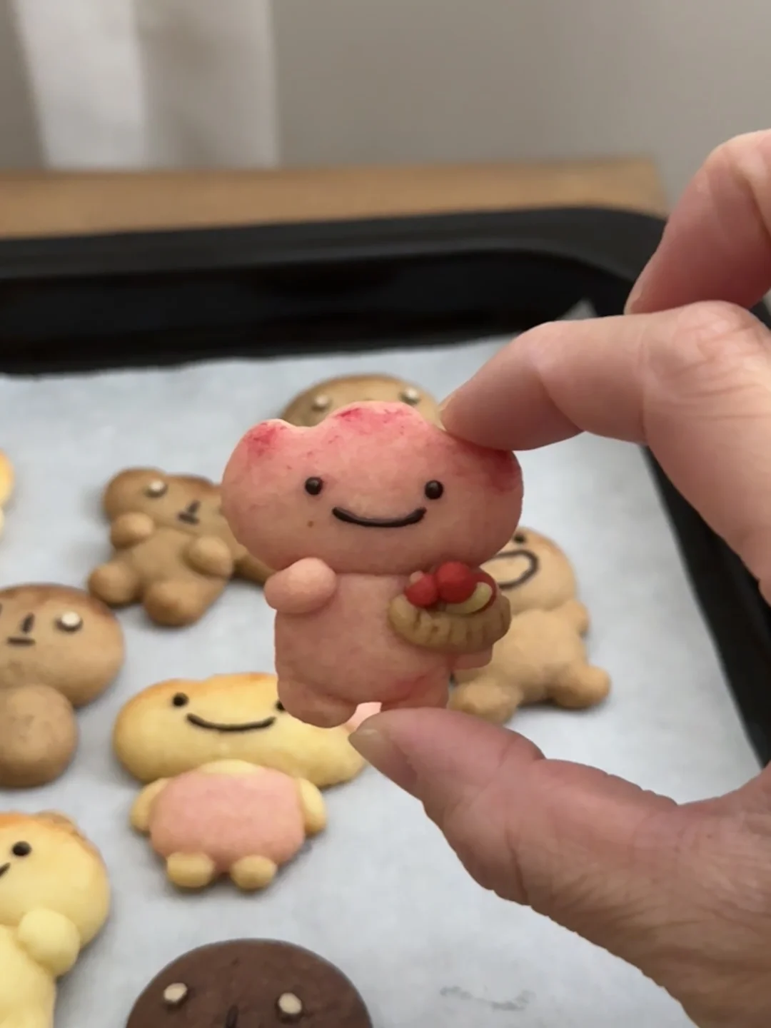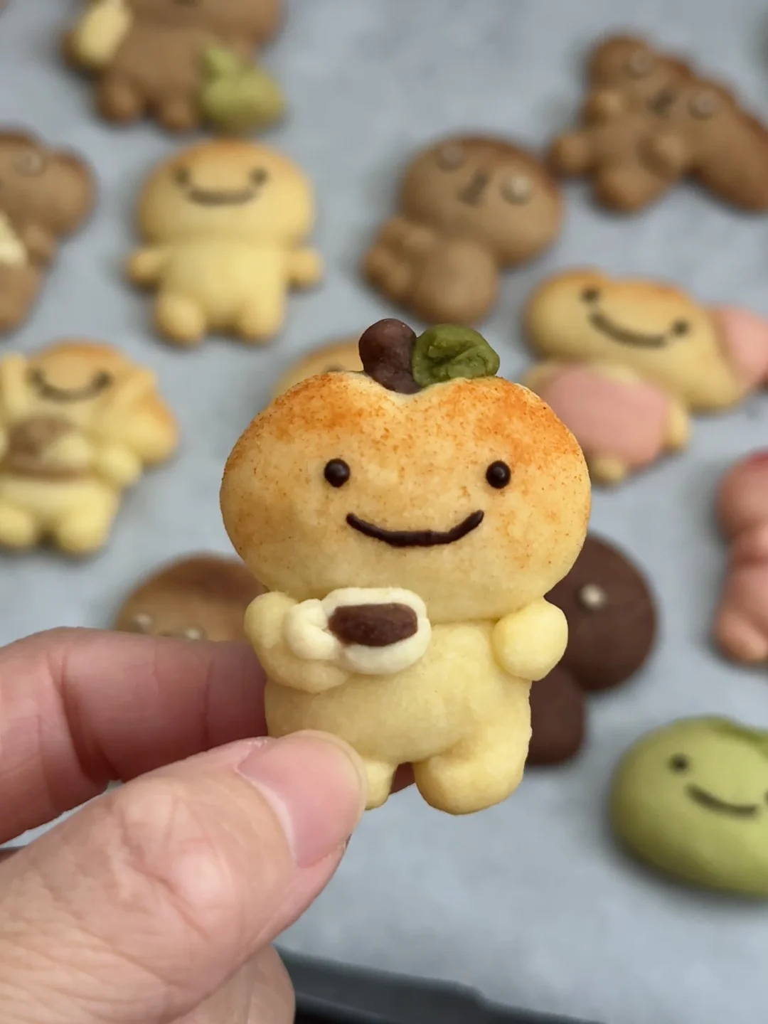 做不了漂亮面包也没有关系呀 总会有人喜欢烤焦面包的🤎 今天是一盘很治愈的萌物曲奇~ - 材料:软化的黄油100g、糖粉40g、低筋面粉180g、常温全蛋液25g 步骤: 1️⃣黄油室温软化,加入糖粉和面粉混合搅拌均匀,分批加入蛋液,混合搅拌成团 2️⃣将面团调好不同颜色的面团,包上保鲜膜放冰箱冷藏松弛15分钟 3️⃣将面团捏成不同造型的烤焦面包,做好的曲奇送入冰箱冷藏2小时或隔夜 4️⃣烤箱150度预热,送入烤箱烘烤25分钟(可根据曲奇的大小调整时间),烘烤8分钟后盖上锡纸,烤好的曲奇晾凉后用巧克力酱画上表情就好啦