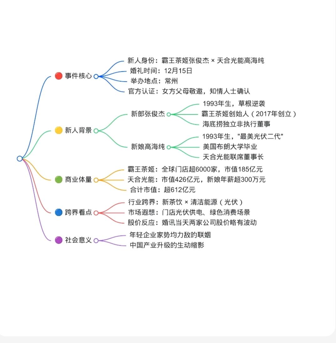 奶茶与光伏的跨界热恋!霸王茶姬创始人与“光伏女神”的世纪联姻刷屏 近日,一张结婚请柬在社交平台引爆全网——霸王茶姬创始人张俊杰将与天合光能联席董事长高海纯喜结连理,这场跨越新茶饮与光伏行业的联姻,堪称商界“强强联合”的典范。 两位新人都是1993年出生,堪称势均力敌的精英典范。新郎张俊杰是草根逆袭的传奇,从奶茶店店员起步,2017年创立霸王茶姬,如今品牌全球门店超6000家,市值达185亿元,还担任海底捞独立非执行董事。新娘高海纯被誉为“最美光伏二代”,毕业于美国布朗大学,凭借自身能力升任天合光能联席董事长,执掌这家市值426亿元的光伏巨头,个人年薪超300万元。 据请柬显示,婚礼将于12月15日在常州举办,由女方父母天合光能创始人高纪凡夫妇亲自敬邀,目前消息已获知情人士确认。两家上市公司市值合计超612亿元,这场婚姻不仅是个人情缘,更引发了市场对“光伏+茶饮”跨界创新的无限遐想,比如门店光伏供电、绿色消费场景打造等新模式都备受期待。 有趣的是,婚讯曝光当天,两家公司股价略有波动,网友纷纷调侃“股民该喝杯霸王茶沾沾喜气”。从街头奶茶到清洁能源,这场联姻既是年轻企业家价值观的契合,也是中国产业升级的生动缩影。祝福这对新人新婚快乐,也期待两大领军品牌未来碰撞出更多商业火花!