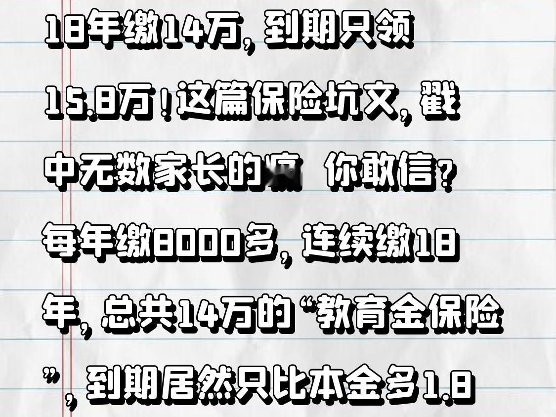 18年缴费14万,到期仅领15.8万!这篇揭露保险坑的文章,戳中无数家长的痛点 你能相信吗?每年缴纳八千多元,连续缴18年,总计投入14万的“教育金保险”,到期时竟只比本金多1.8万。连通货膨胀都赶不上,这哪是什么理财,分明是给保险公司“白送钱”! 前几日刷到一位网友的真实经历,越看越让人揪心,仿佛看到众多被保险套路的普通家庭。网友夫妻在女儿出生时购买了一份“阳光宝贝成长险”,业务员拍着胸脯保证“既有教育金又有分红,比存银行强十倍”。夫妻俩省吃俭用18年,从未中断过保费缴纳,满心期待到期能为女儿提供考研费用、实现毕业旅行的梦想,本以为能领到近20万。 然而现实却狠狠打脸——他们请假兴冲冲去领钱,得到的结果却是满期金额仅有15.8万。18年的等待,14万的本金,收益竟不如银行三年定期。更令人崩溃的是,当初业务员口中“每年至少几千分红”,实际多年只有几十块,最多的一年也才一千出头。想找业务员理论,却发现对方早已离职,电话号码成了空号,保险公司只扔下一句“合同写得清楚,分红不保证”。 这篇文章中的冲突,实在太让人感触颇深:夫妻满心欢喜的期待与15.8万现实之间的巨大落差,业务员夸大其词的承诺与合同里“灰色小字”的陷阱,消费者维权无门与保险公司的淡定推诿。网友夫妻当场争吵、蹲在大厅角落委屈落泪的场景,想想就让人感同身受——谁的钱不是辛苦积攒下来的?谁不是怀着为孩子未来打算的心思买保险?可最终却被套路得彻彻底底。 实际上,这篇文章揭露的正是众多理财型保险的通病:业务员用“高收益”“稳赚不赔”的口头承诺来画大饼,却把“分红不确定”“收益保底低”藏在密密麻麻的合同条款中。普通消费者不懂专业术语,轻信了花言巧语,等到满期才发现被坑,可合同在手,投诉无门,只能自认倒霉。 作为家长,太能体会这份无奈与愤怒了。为了孩子的未来,我们愿意省吃俭用做长远规划,最怕的就是这份心意被不良商家利用。这篇文章也给所有家长提了个醒:购买长期保险,千万别轻信口头承诺,合同条款一定要逐字逐句仔细研读,看不懂就找专业人士咨询,别让“爱”变成“坑”。 你是否有过买保险被坑的经历?或者你对理财型保险有哪些避坑经验?欢迎在评论区分享,让更多人少走弯路!