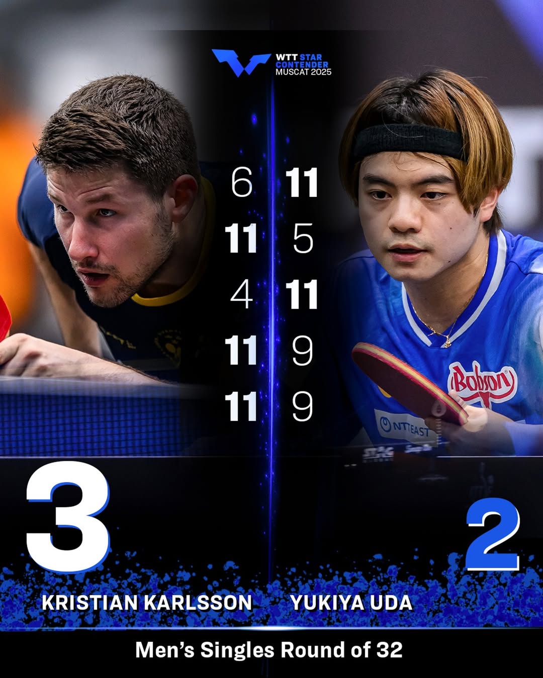 WTTins报道。在WTT马斯喀特站16强赛中,瑞典选手克里斯蒂安·卡尔松经过五局激烈对决,战胜8号种子日本选手宇田幸矢,成功晋级16强!#WTTMuscat#TableTennis