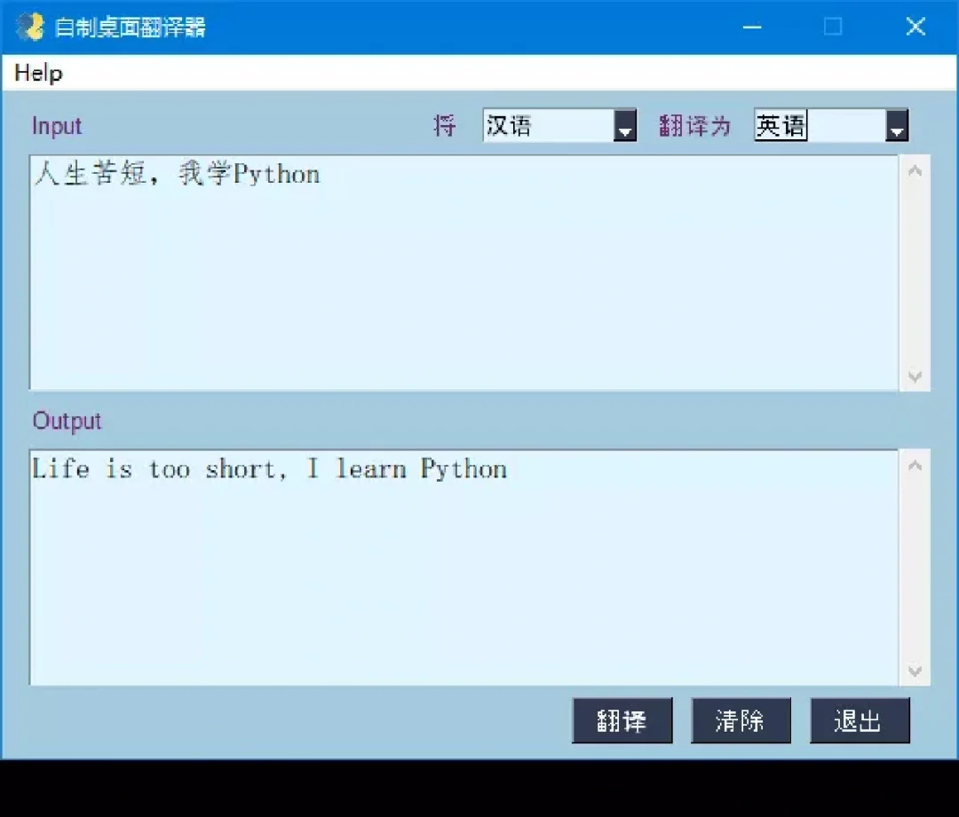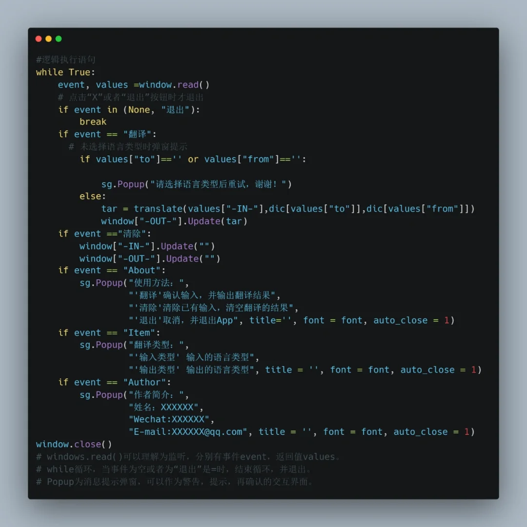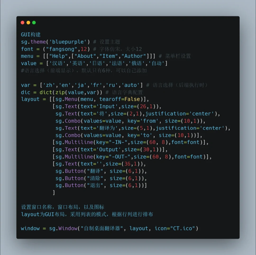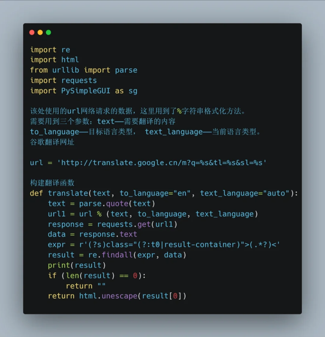 基于PySimpleGUI开发桌面GUI➡️获取键盘输入➡️接入谷歌翻译API➡️爬虫获取翻译结果(其中涉及到正则表达式匹配翻译结果)➡️输出翻译结果➡️翻译完成。