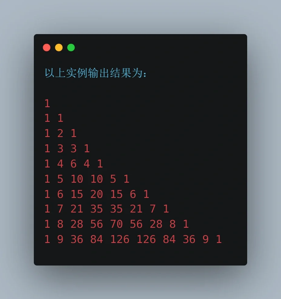 Python经典实例[六R][一R] ~ [一R]题目: 打印出杨辉三角形(要求打印出10行)。 [二R]程序分析: 无。 ~