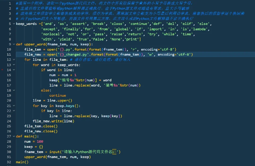 [四R]编写一个程序,读取一个python源代码文件,将文件中所有除保留字意外的小写字母换成大写字母,生成后的文件要能够被python解释器正确执行。