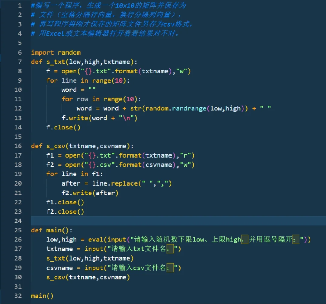 [三R]编写一个程序,生成一个10x10的矩阵并保存为文件(空格分隔行向量,换行分隔列向量),再写程序将刚才保存的矩阵文件另存为csv格式,用Excel或文本编辑器打开看看结果对不对。