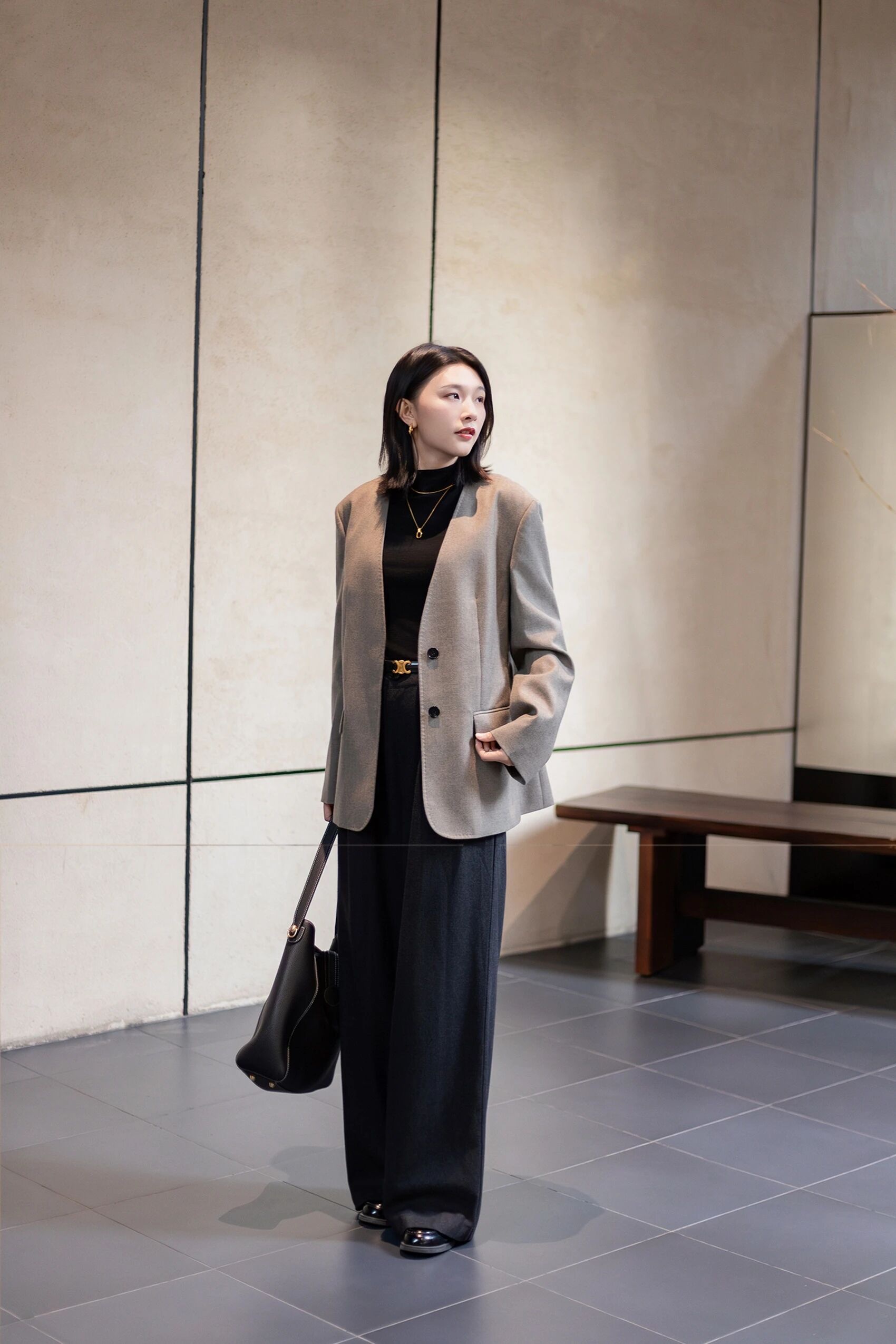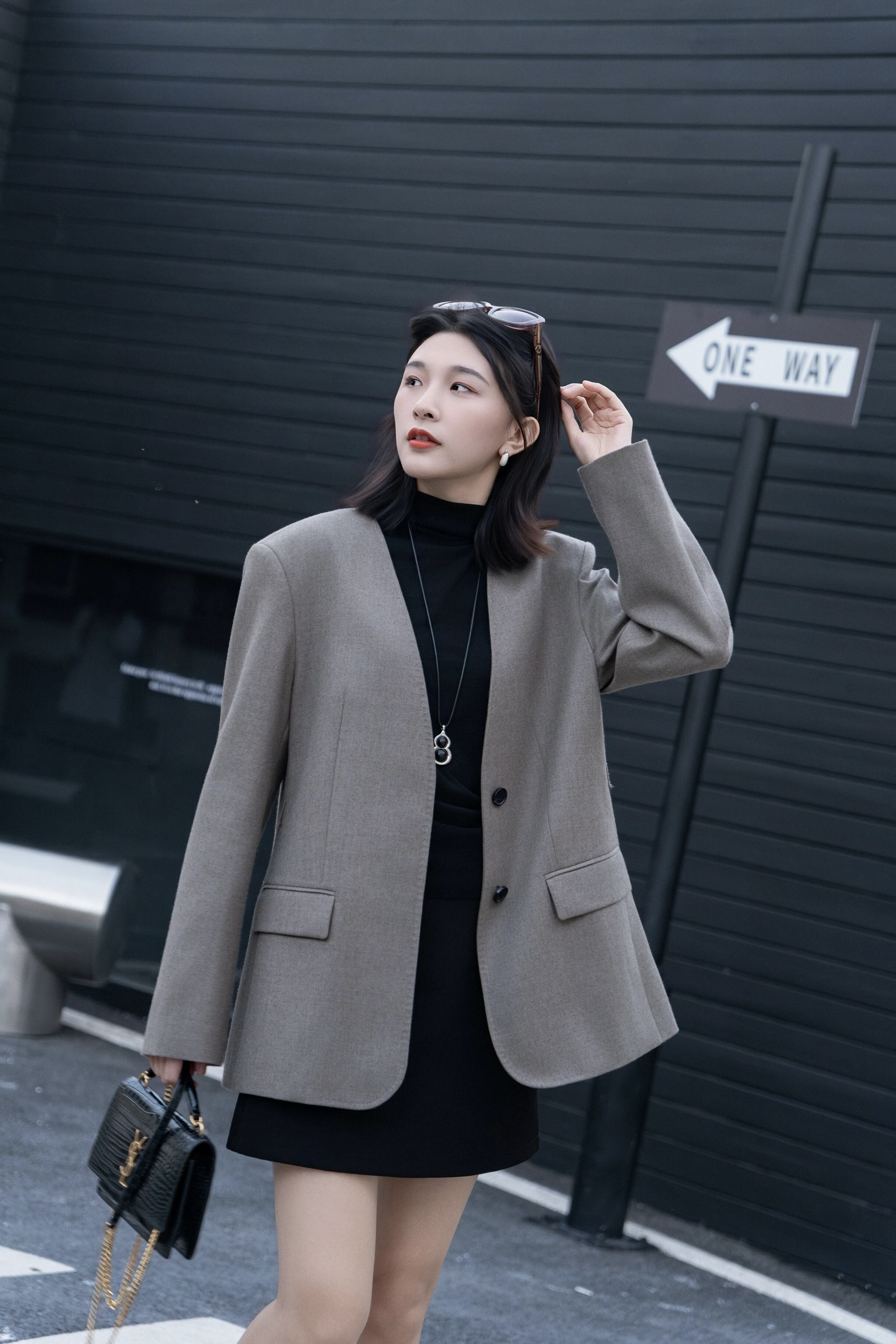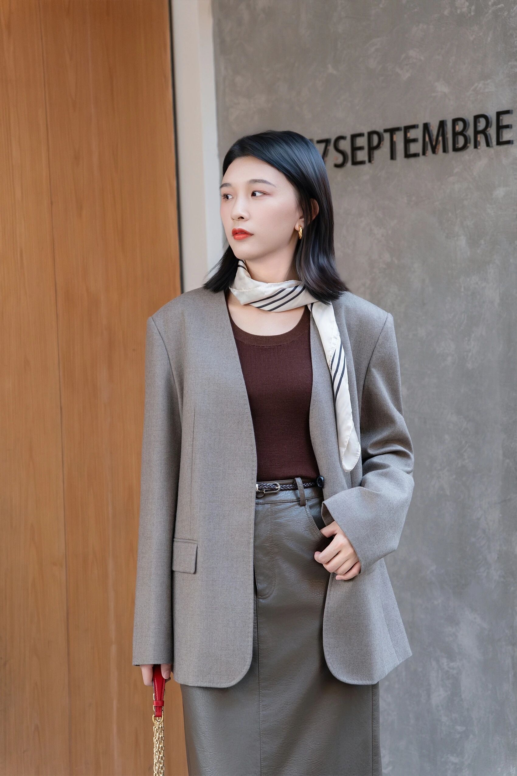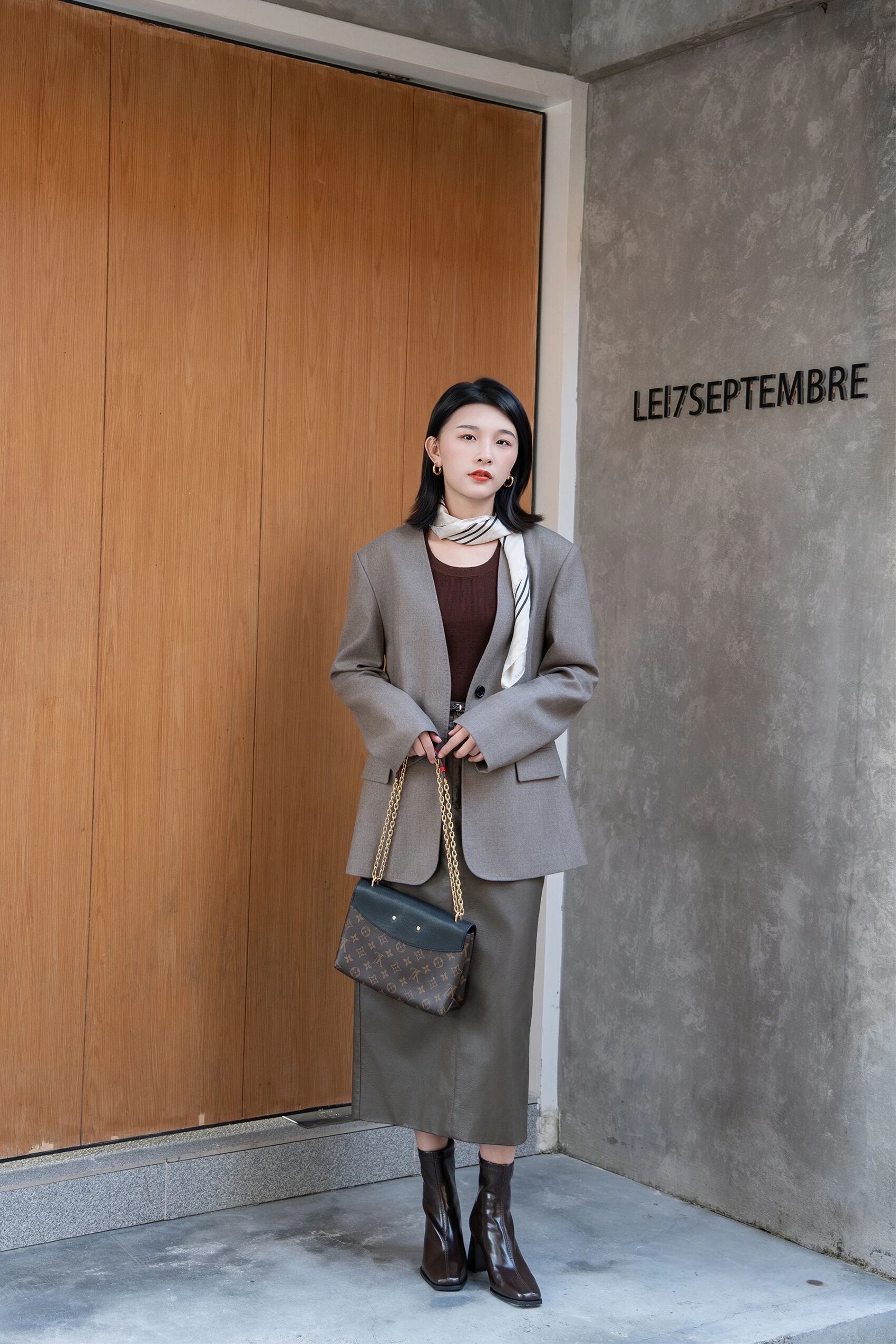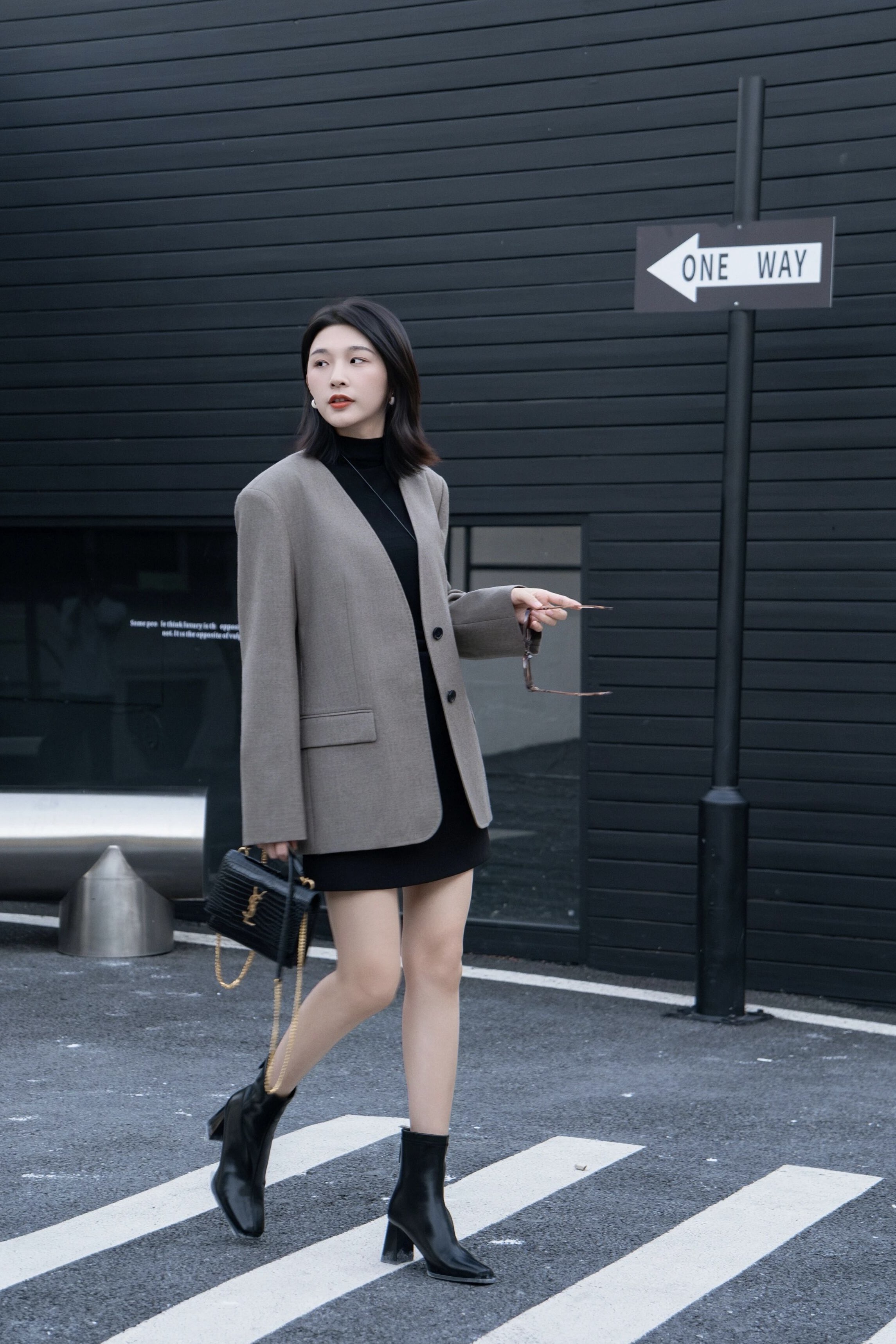 通勤穿搭|浅棕西装松弛又利落,搭短裙衬出纤细腿型,配皮裙则添了柔媚,丝...