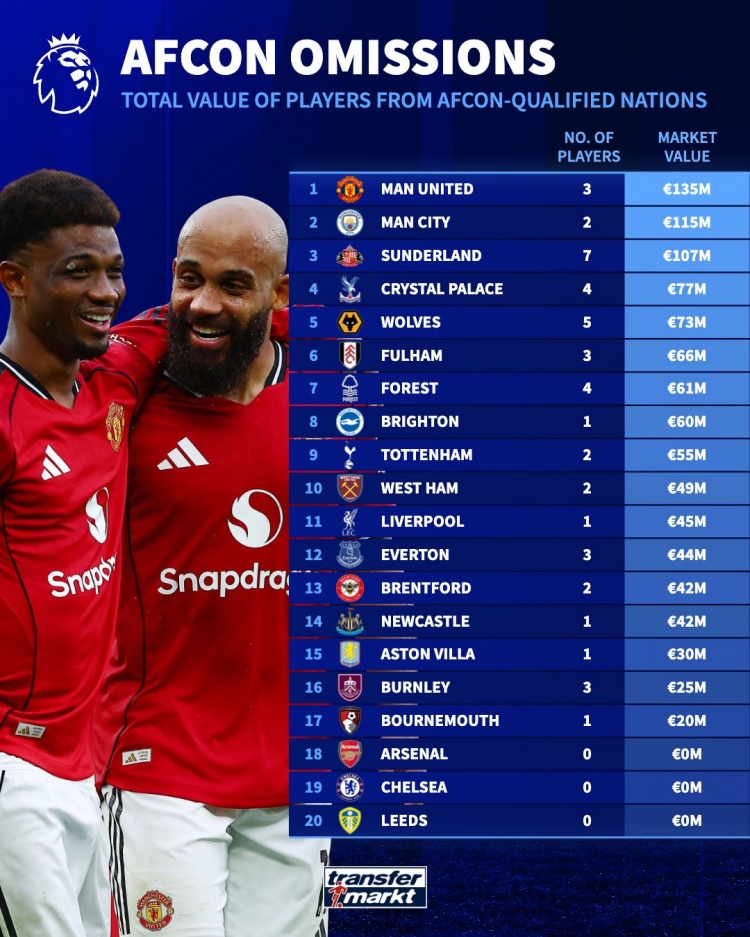 直播吧11月21日讯德国转会市场统计了英超各队将参加非洲杯球员的身价,并列出排名,曼联1.35亿欧居首,曼城1.15亿欧次席。