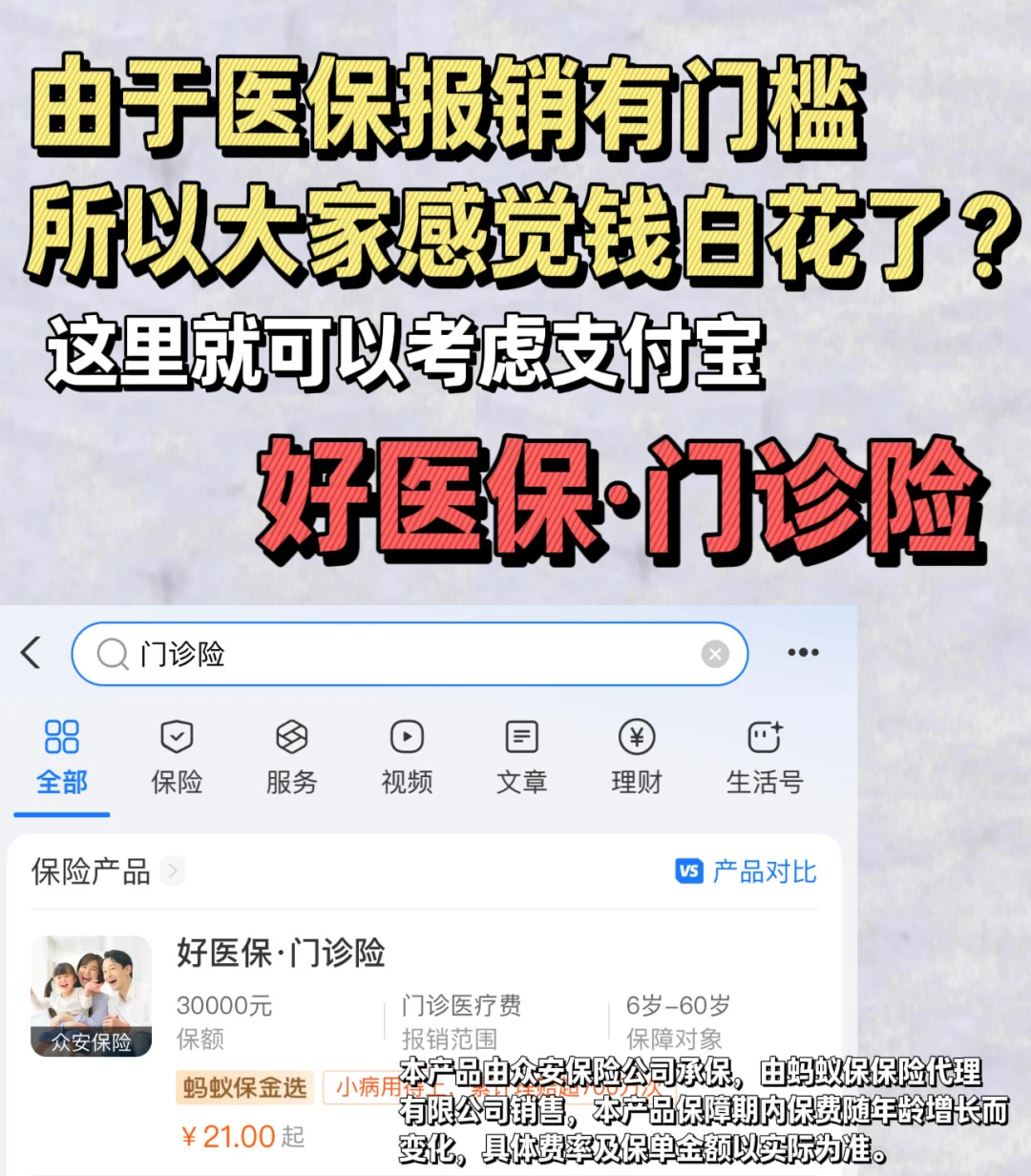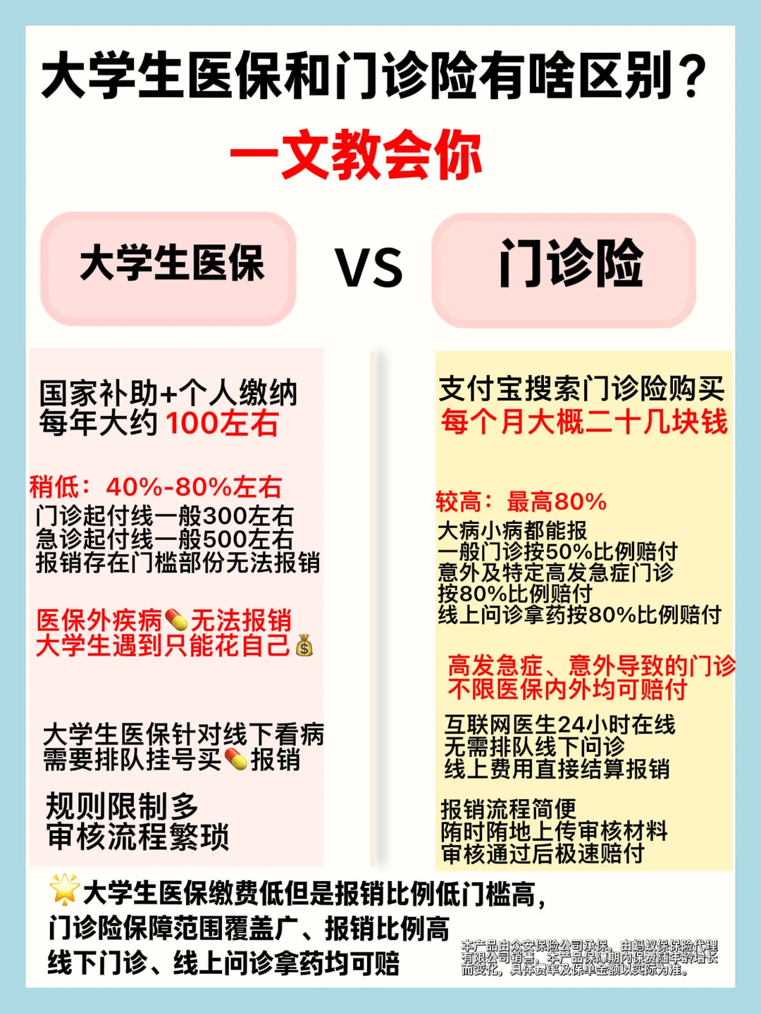 🌟交了了三年大学生医保,生病去🏥一分钱都报不了,看着室友刷医保账户付医药费,自己的账户却始终显示余额不足,别慌不是你白交,而是你没有弄懂正确使用方法 - ❤️首先我们先搞清楚核心问题,为什么你的医保账户没钱? 大学生医保分为两大账户:个人账户和统筹账户 我们去医院看病刷的医保是前者,里面的钱来自每个月的工资扣的社保,可以直接刷医药费,大学生没有工资,自然个人账户里没钱。 - 那我们交的医保钱去哪里?主要来自第二个账户,统筹账户来自大家交的医保基金,我们大家交的保费补贴都来自这个账户,能不能报销看你能不能达到报销标准? 1⃣️必须达到起付线,特大三甲🏥都是600起步 2⃣️有些情况报不了,例如小感冒买💊,需要搞清楚什么疾病可以报销 3⃣️要去医保定点机构,报销流程繁琐审核慢,条框规定限制多 这么一看,大学生医保无法覆盖所有疾病甚至我们日常疾病都报不了 - 👌那么大学生医保达不到报销条件怎么办? 可以考虑下支付宝的门诊险,相比于统筹账户标准限定,一般门诊费用均可报销,覆盖广赔付比例高还实用,就连我们线上买药也可以赔付! 1⃣️平时经常头疼脑热跑🏥,一趟下来也有几百但总够不上大学生医保起付线,这时候门诊险就很重要了,覆盖一般门诊挂号费、药品费等一系列费用,可按50%比例赔付,平常小病小痛去一趟门诊花个小几百大学生医保报销不了很难受?门诊险帮你找回来! 另外针对意外情况以及流感、食物中毒等16特定日常高发急症,不限医保内外可按80%比例赔付而且无起付线,对于大学生来说实用性拉满! 2⃣️像是平常不舒服买💊,可以直接从支付宝门诊险后台线上问诊拿💊,也可以直接进入门诊险保单,下单直接按80%比例赔付,这一点大学生医保可做不到,但门诊险全都保障了! 3⃣️关键的一点,门诊险赔付报销流程简便,线下随时随地直接上传病历、发票,审核通过后1-3天就能收到赔付,简直不要太省心! - ☝️如果说国家给予的医保是以防万一,心安兜底 那么门诊险就是更贴切我们的生活,省心实用! 医保和门诊险共同协调,弥补阙漏,给大家一个安心的看病体验! *本产品由众安保险公司承保,由蚂蚁保保险代理有限公司销售,本产品保障期内保费随年龄增长而变化,具体费率及保单金额以实际为准。