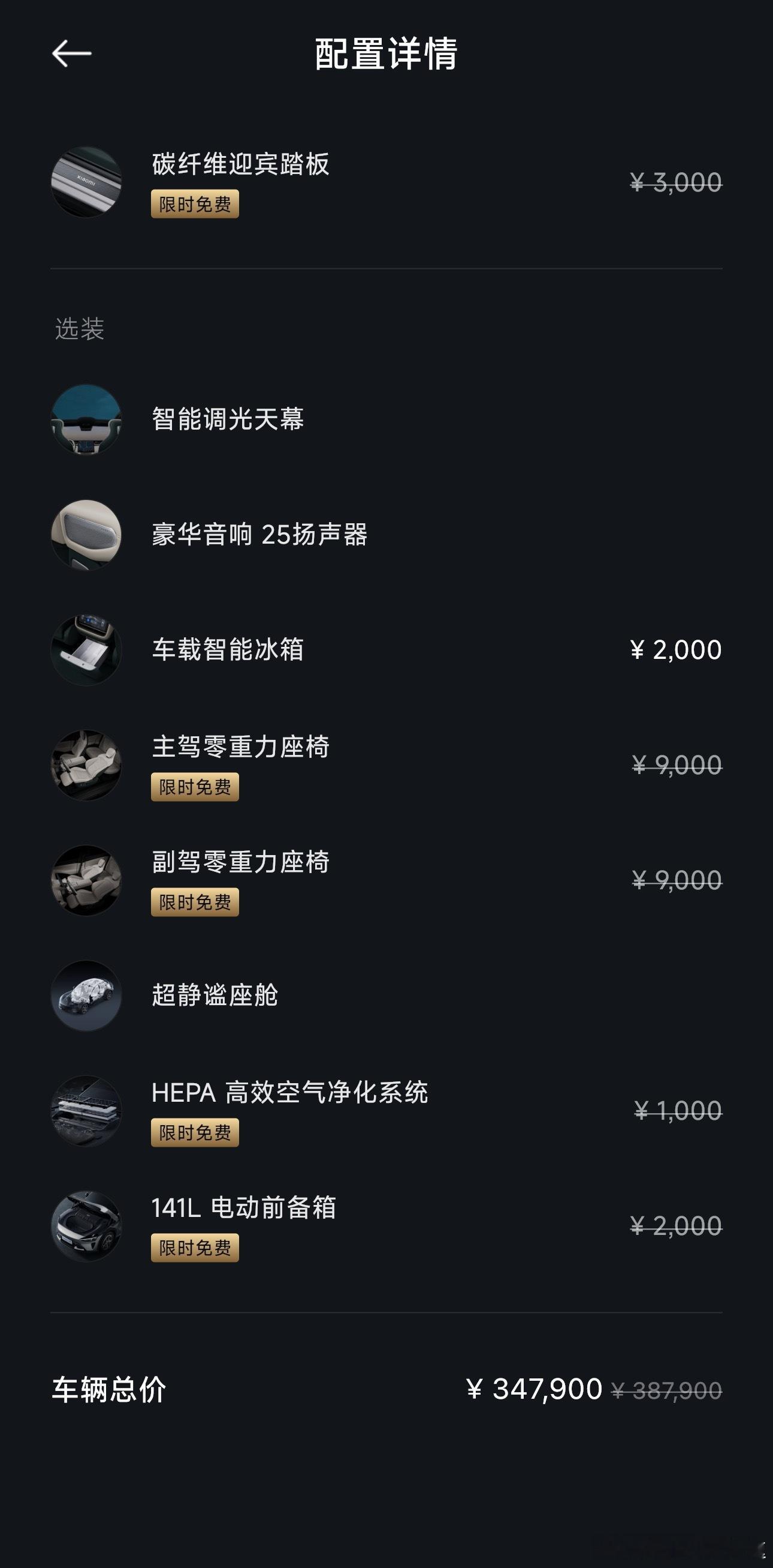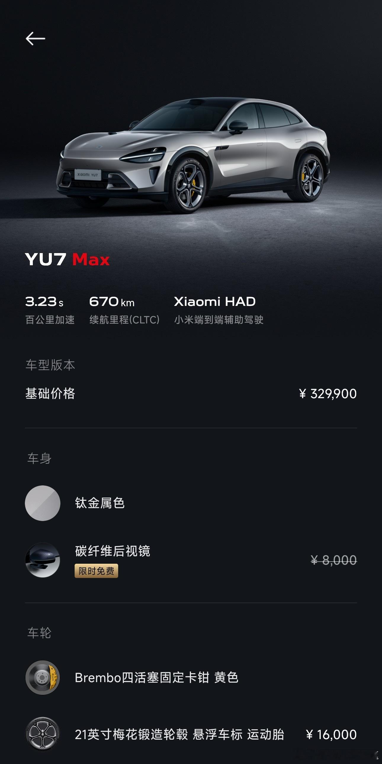 6月份定的小米Yu7 Max有人要吗?交付最近来了三次电话,两次顺延车,1次通知快下线了,我提了i6 确实没指标了Yu7 Max 钛金属➕松石灰,选了冰箱、21寸锻造梅花圈 运动胎,还有首销期送的碳纤维后视镜、碳纤维迎宾踏板、主副驾零重力座椅、空气净化系统、电动前备箱。感兴趣找我,尽快~