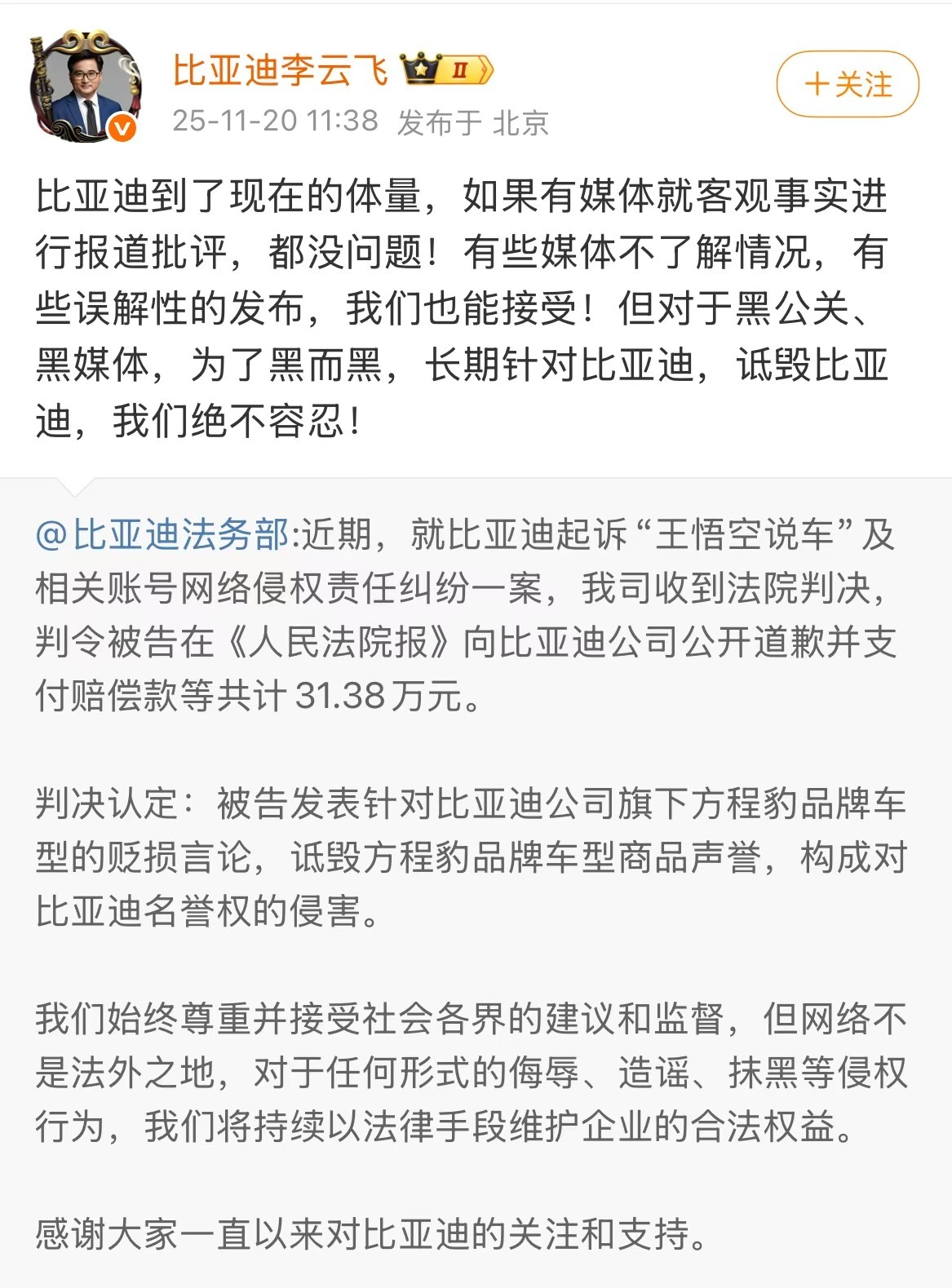 近日,比亚迪起诉自媒体账号“王悟空说车”的案件尘埃落定。法院最终判决,被告需向比亚迪公开赔礼道歉,并支付共计31.38万元赔偿款。这笔赔偿或许不算高额,但对比亚迪而言意义重大,因为它彰显了企业对“为黑而黑”、长期针对诋毁的黑公关、黑媒体的零容忍态度与坚定决心。 当前中国新能源汽车行业正加速迈向高质量发展阶段,技术竞争才是良性之争,而非一味抹黑、煽动舆论。比亚迪作为行业头部企业,以法律手段打击“黑公关”,既坚守了正确价值观,也净化整个汽车行业的舆论压力,更能让消费者清晰判断哪些车企及产品适合自己与家庭。在此呼吁网友与汽车品牌共同坚守底线,践行良性之争!
