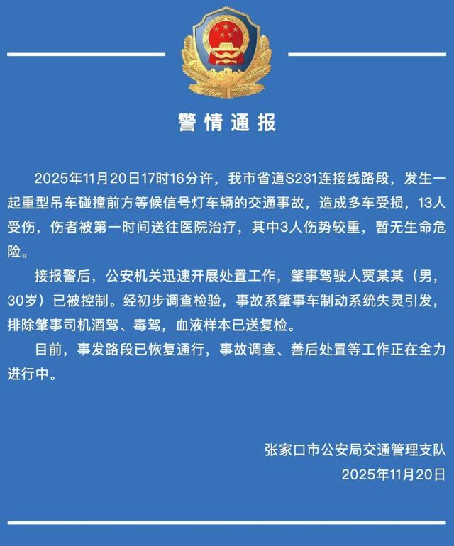 11月20日晚,张家口市公安局交通管理支队发布警情通报,2025年11月20日17时16分许,该市省道S231连接线路段,发生一起重型吊车碰撞前方等候信号灯车辆的交通事故,造成多车受损,13人受伤,伤者被第一时间送往医院治疗,其中3人伤势较重,暂无生命危险。