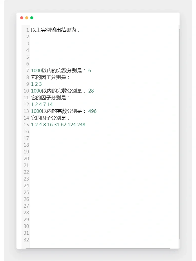 Python经典实例1⃣9⃣ ~ ⭐️题目: 一个数如果恰好等于它的因子之和,这个数就称为"完数"。例如6=1+2+3。 编程找出1000以内的所有完数。 ~ 🌟程序分析: 请参照程序Python 练习实例14。 之前发的Python经典实例1⃣4⃣有讲怎么算因数的。 ~ ❗️❗️❗️本题中的stt.write()方法是把字符写入到标准输入出,也就是控制台,和print是一样的功能。 ~
