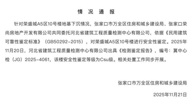11月21日晚,张家口市万全区住房和城乡建设局再次发布情况通报,针对荣盛城A5区10号楼地基下沉情况,张家口市万全区住房和城乡建设局、张家口荣尚房地产开发有限公司共同委托河北省建筑工程质量检测中心有限公司,依据《民用建筑可靠性鉴定标准》(GB50292-2015),对荣盛城A5区10号楼进行安全性鉴定。2025年11月20日,河北省建筑工程质量检测中心有限公司出具《检测鉴定报告》,编号:冀中心检(JG)2025-4061,该楼安全性鉴定等级为Csu级。相关处置工作同步开展。