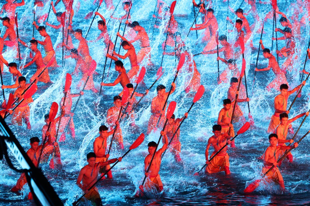 3790平方米的水上舞台出现在海面上,远处的城市天际线与舞台完美融合,漫天星辰闪烁中,“纸张舞台”破水而出,寓意“深圳是中国特色社会主义在一张白纸上的精彩演绎”。
