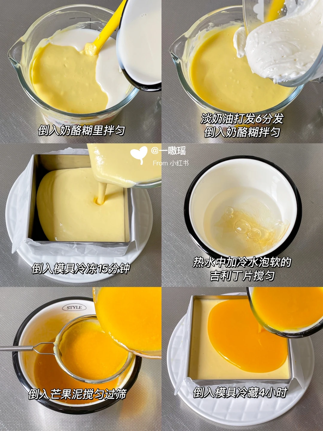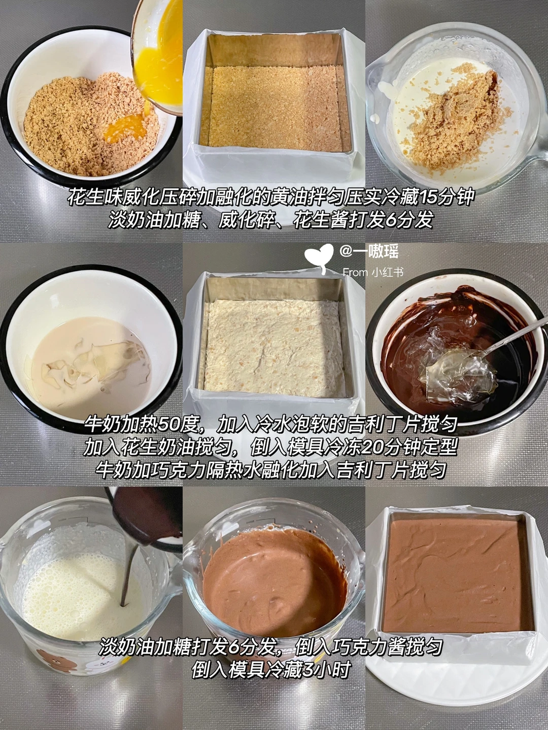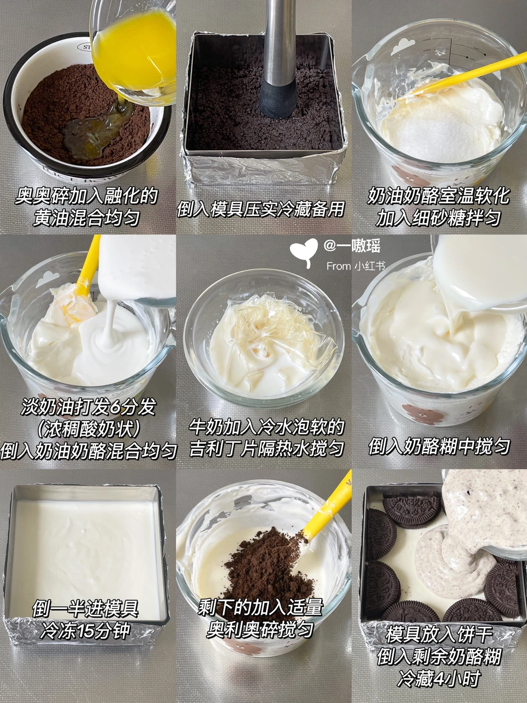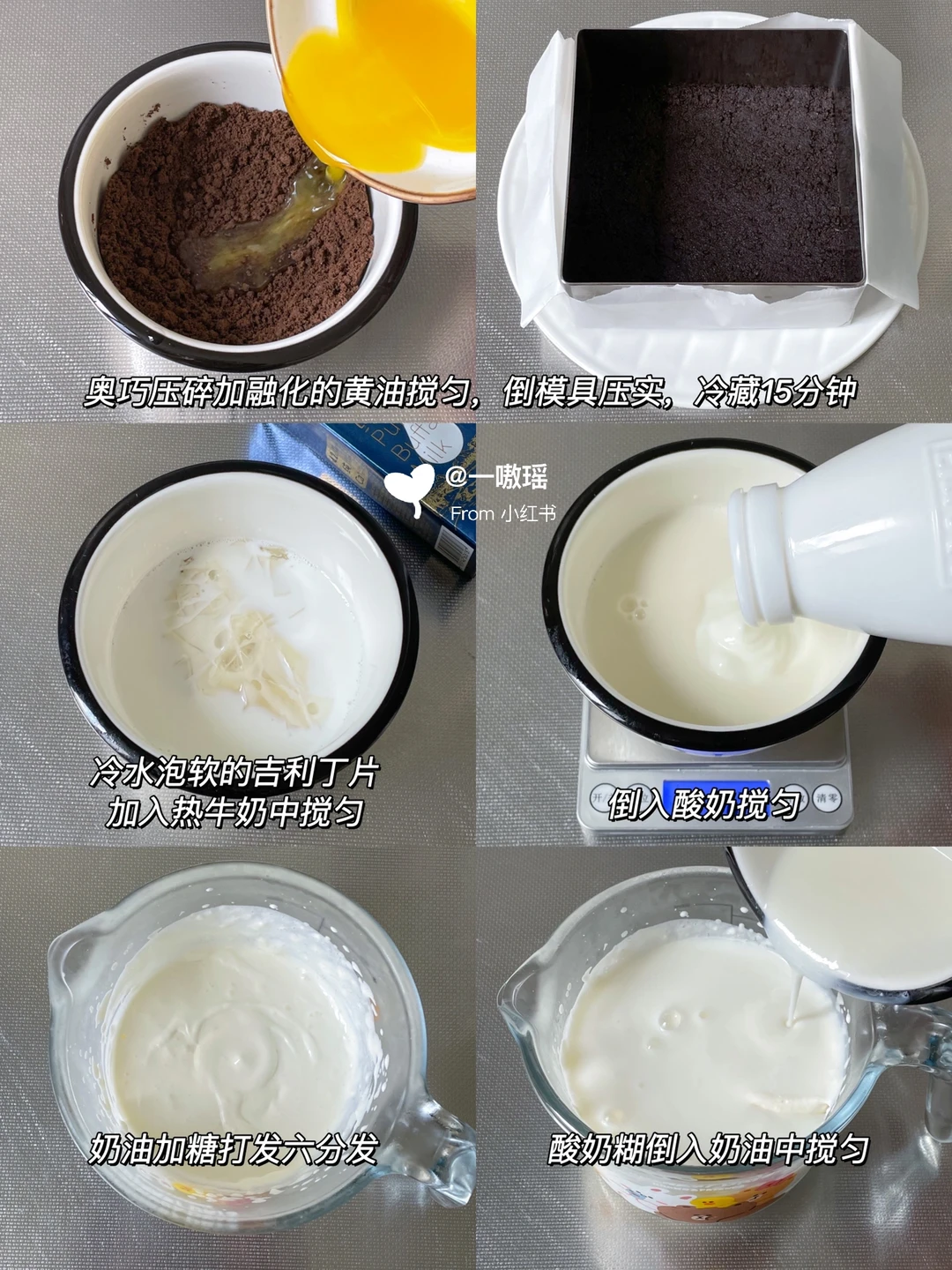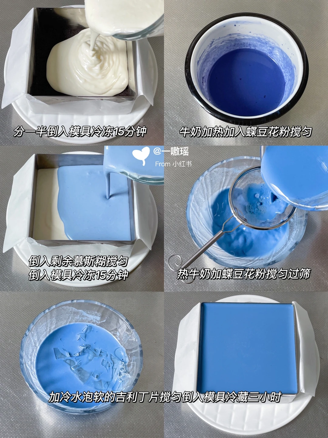 冰冰凉凉四款自制慕斯蛋糕🎂 搅一搅就能做,绵密丝滑 奶香浓郁 超级简单又好吃,颜值也很在线!不需要烤箱很方便 - 1⃣️ 冰蓝酸奶慕斯蛋糕🌊 🛒食材(模具/对角6寸) ▪️饼干底 奥利奥饼干碎55g 黄油30g ▪️酸奶慕斯 水牛奶70g 酸奶150g 淡奶油150g 细砂糖12g 吉利丁片10g 蝶豆花粉2g ▪️奶冻 水牛奶80g 蝶豆花粉2g 吉利丁片5g 糖3g · 2⃣️ 芒果乳酪慕斯🥭 🛒食材(模具/对角6寸) ▪️饼干底 奥利奥饼干碎55g 黄油30g ▪️芒果芝士慕斯 牛奶50g 奶油奶酪180g 淡奶油120g 细砂糖20g 吉利丁片10g 芒果泥150g ▪️芒果镜面 热水50g 芒果泥50g 吉利丁片5g · 3⃣️ 奥利奥芝士慕斯🍫 🛒食材 奥奥碎50g 黄油30g 奶油奶酪180g 细砂糖20g 淡奶油180g 吉利丁片10g 牛奶60g · 4⃣️ 巧克力花生慕斯🥜 🛒食材 花生味威化70g 黄油30g 淡奶油240g 糖13g 牛奶80g 黑巧(用的100%纯黑)50g 吉利丁片10g 👩🏻‍🍳做法 ▫️50g花生味威化压碎,加融化的黄油拌匀压实冷藏15分钟 ▫️120g淡奶油加8g糖、20g威化碎、两大勺花生酱打发至6分发 ▫️30g牛奶加热50度,加入5g冷水泡软的吉利丁片搅匀 ▫️加入花生奶油搅匀,倒入模具冷冻20分钟定型 ▫️50g牛奶加50g纯黑巧隔热水融化 ▫️加入5g吉利丁片搅匀 ▫️120g淡奶油加5g糖打发6分发,倒入巧克力酱搅匀 ▫️倒入模具,冷藏3小时 ▫️取出淋上花生奶油简单装饰即可