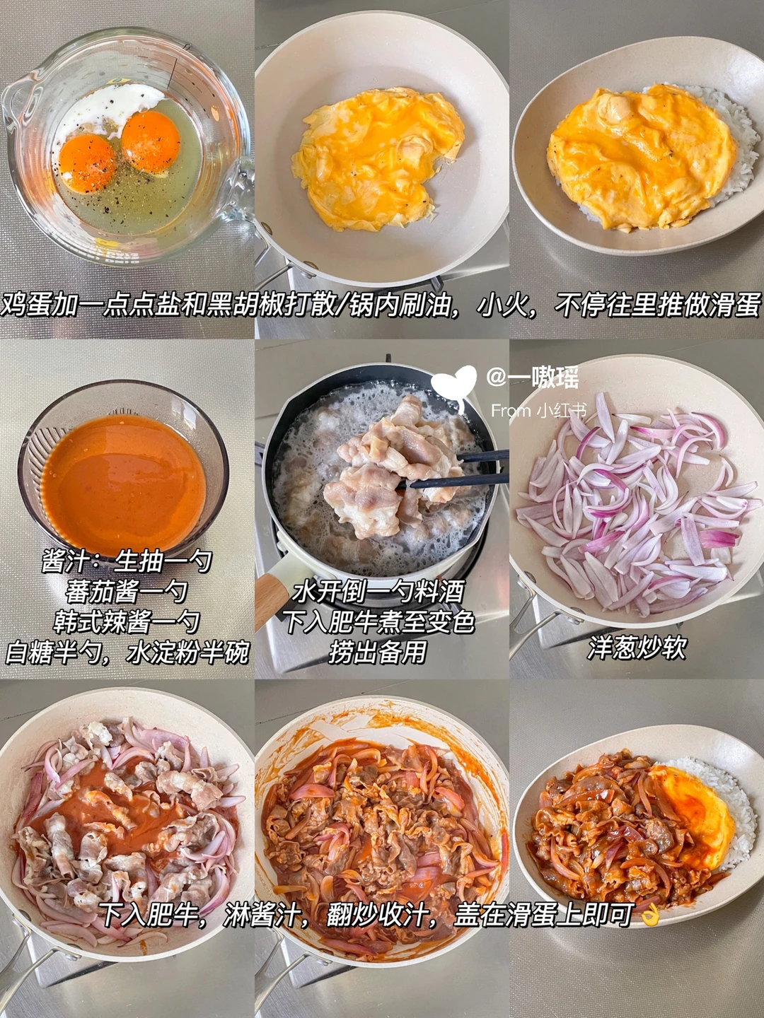 整理了6款巨美味的快手懒人盖饭!🥣 0难度,一学就会~ 好吃到起飞[吧唧R] 详细做法见图解 🔍 - ▪️照烧鸡腿饭 📍食材:鸡全腿 鸡蛋 牛奶 生姜 ▪️葱油脆皮鸡饭 📍食材:鸡全腿 小葱 生姜 ▪️芦笋炒牛肉盖饭 📍食材:牛肉 芦笋 大蒜头 ▪️蟹柳炒蛋盖饭 📍食材:蟹柳 鸡蛋 小葱花 ▪️韩式肥牛滑蛋饭 📍食材:鸡蛋 肥牛 洋葱 韩式辣酱 番茄酱 ▪️肉末抱蛋豆腐盖饭 📍食材:鸡蛋 嫩豆腐 猪肉末 小葱花