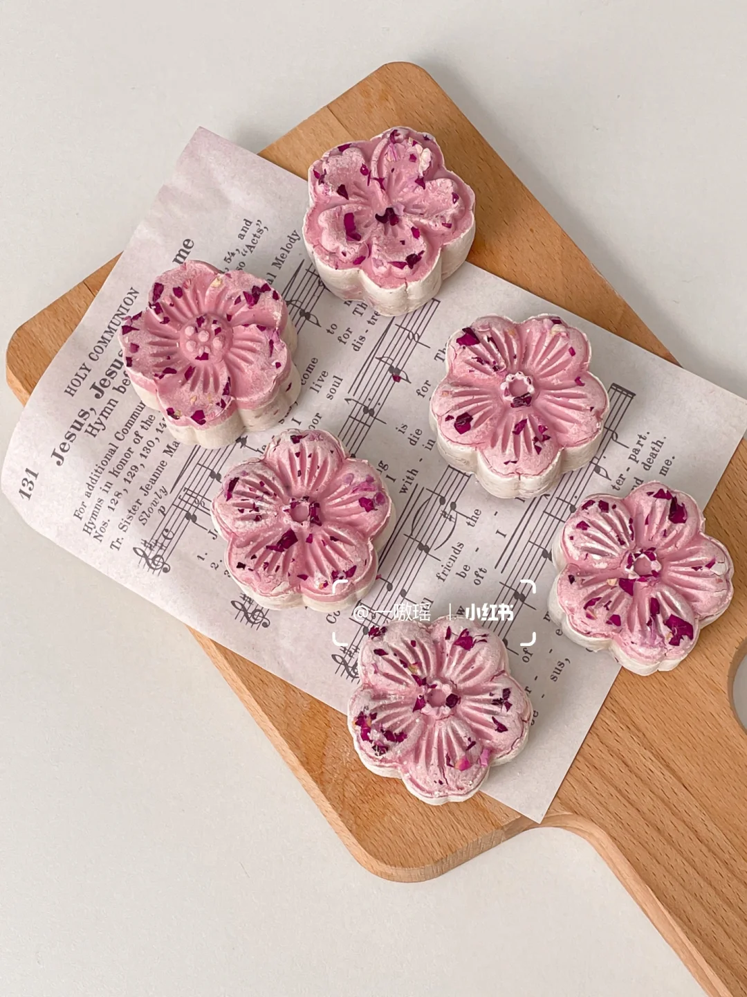 ▫️模具中先撒一点玫瑰花瓣碎,再放入粉色山药团和白色山药团,按压脱模
