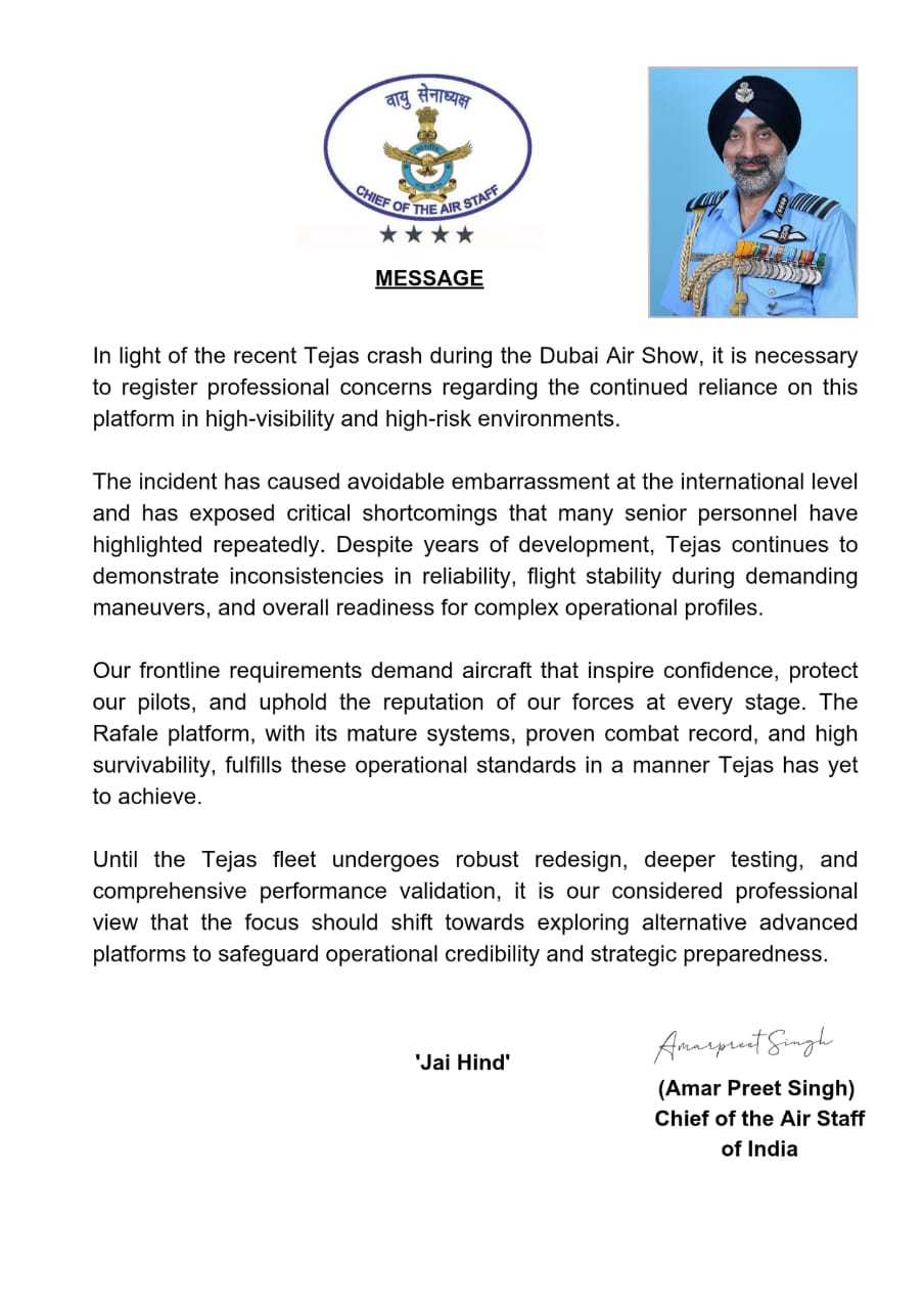 在经过短暂的沉默之后,印度空军参谋长辛格发表了致印度空军公开信,一句话总结就是:造不如买致空军人员的函件印度空军参谋长 阿玛尔・普雷特・辛格(Amar Preet Singh)鉴于近期 “光辉”(Tejas)战机在迪拜航展期间发生坠毁事故,有必要就该平台在高曝光、高风险环境下的持续使用问题,提出专业关切。此次事件在国际层面造成了本可避免的尴尬,并暴露了诸多关键缺陷 —— 这些缺陷已被多位资深人士反复强调。尽管历经多年研发,“光辉” 战机在可靠性、高难度机动时的飞行稳定性,以及应对复杂作战任务的整体战备状态方面,仍存在持续性的不一致问题。我们的一线作战需求,要求战机能够树立信心、保护飞行员,并在每一个环节维护部队声誉。“阵风”(Rafale)平台凭借成熟的系统、经实战验证的作战记录和高生存能力,以 “光辉” 尚未实现的方式满足了这些作战标准。在 “光辉” 机队完成彻底重新设计、深入测试及全面性能验证之前,我们的专业意见是:应将重心转向探索替代先进平台,以保障作战可信度和战略战备水平。“印度必胜”(Jai Hind)