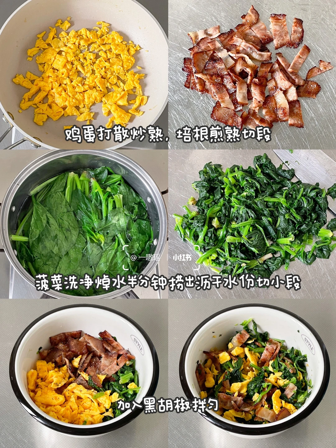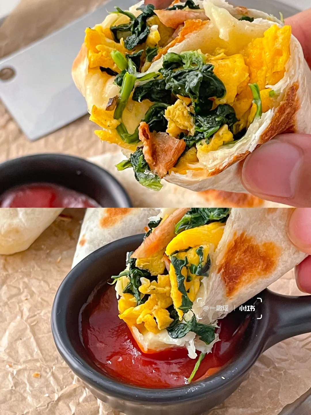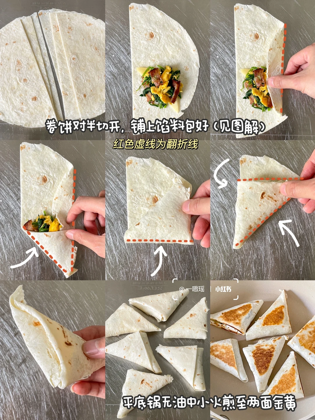 新get的卷饼方法✨看上去很厉害,实际很简单,迫不及待来分享 直接用卷饼做出减脂口袋饼 鲜香的菠菜、焦脆的培根、香喷喷的炒蛋,还有奶味浓郁的芝士片,多重口感交织在一起,咸香可口! [太阳R] 零难度的快手轻食早餐🥬🧀🥓 - 🛒食材 菠菜、培根、鸡蛋、卷饼、芝士片 👩🏻‍🍳做法 1、鸡蛋打散炒熟,培根煎熟切小段 2、菠菜洗净焯水半分钟捞出,沥干水份切小段 3、混合,加入黑胡椒拌匀 4、卷饼对半切开 5、铺上芝士片和馅料如图所示包好(上图有教程) 6、平底锅无油中小火煎至两面金黄即可(也可以用黄油煎,更香) - 🔴 ▫️蘸上喜欢的酱料,辣酱和沙拉酱都是不错的选择 ▫️可以用金枪鱼代替培根,更好吃噢(因为我在消耗培根•᎔•) 学会这个包法,就可以随心所欲做各种馅料口味啦!