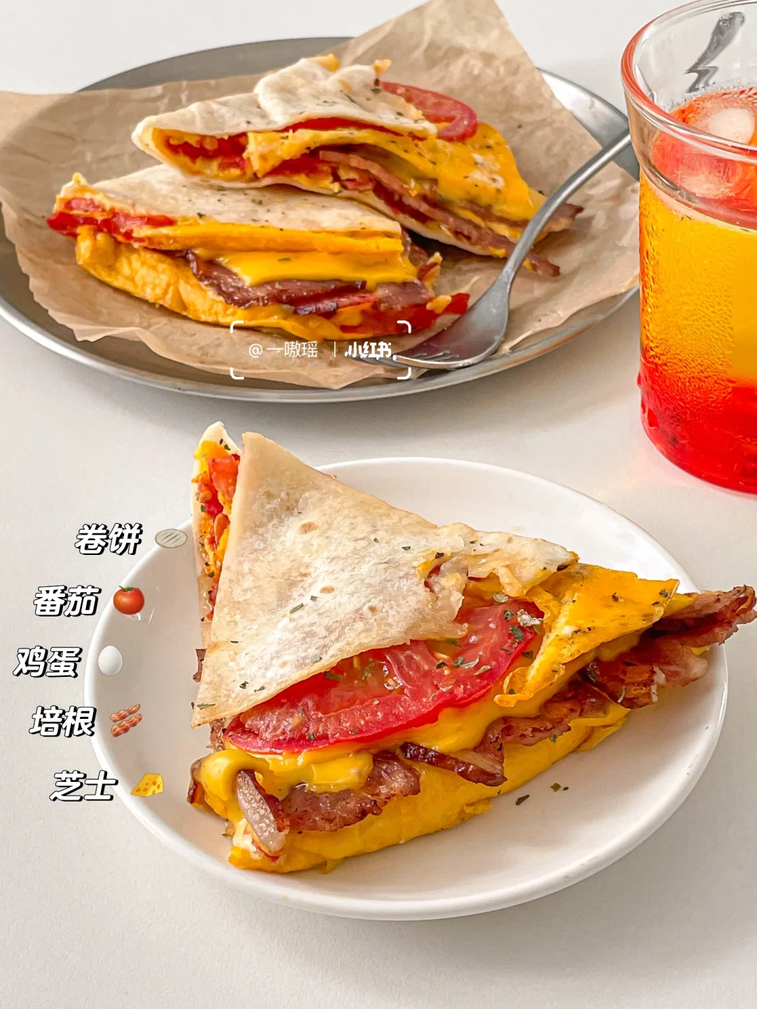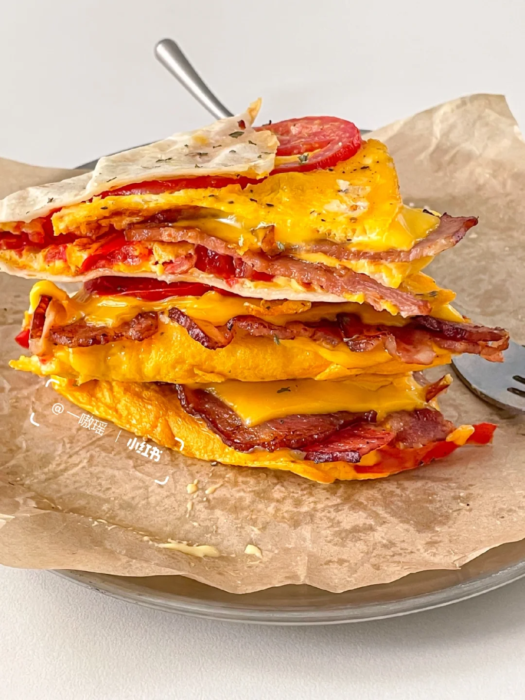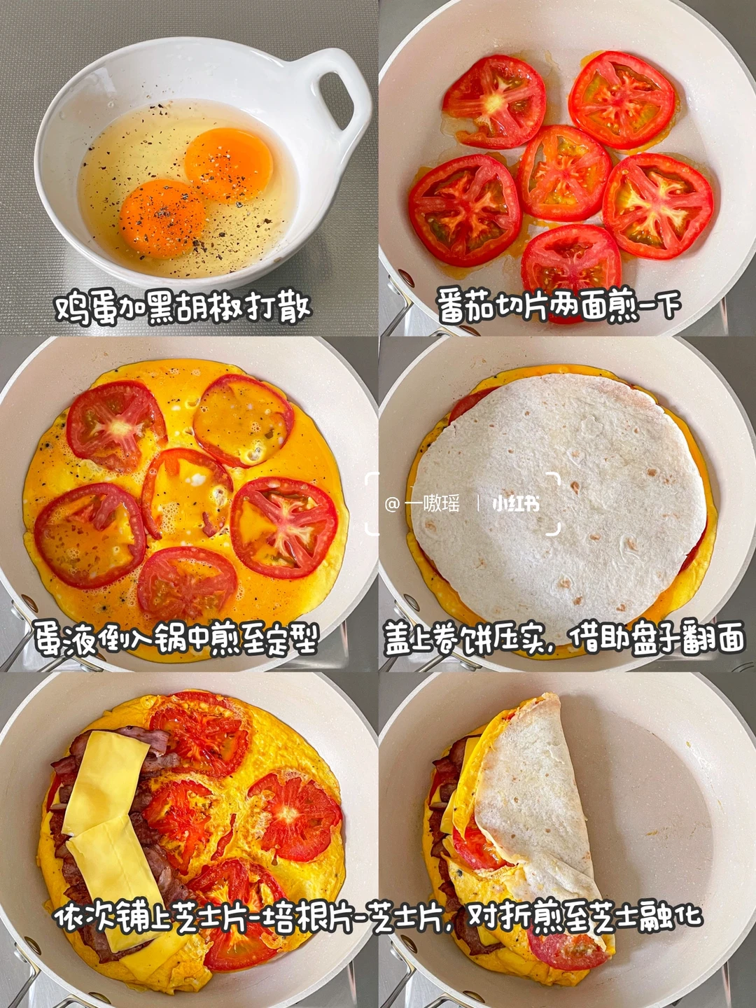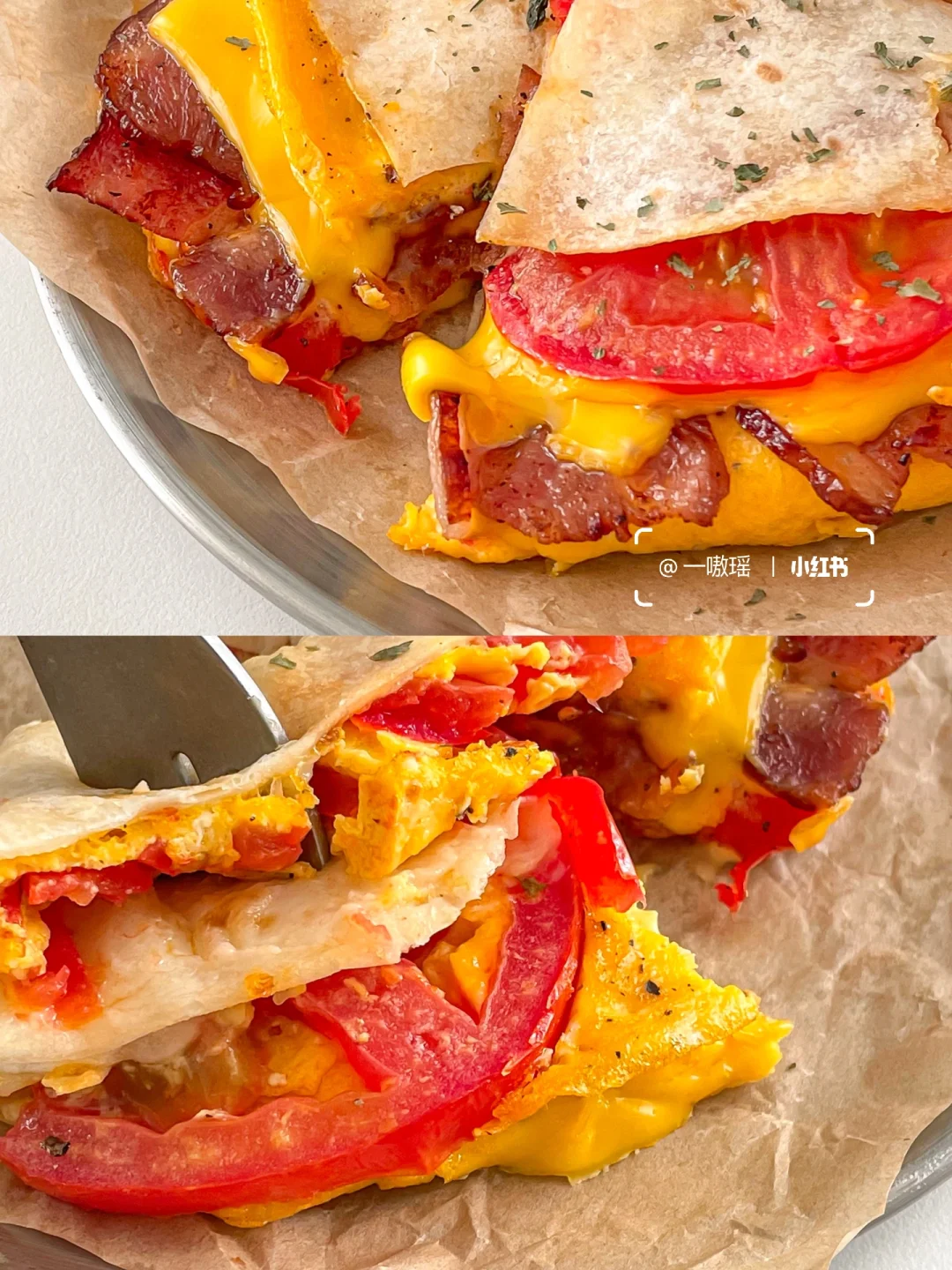 10分钟快手减脂早餐🍅🧀🥓 •̀֊•́ 零难度! 鲜香鲜香的, 每一种食材都贡献了独特风味 🍅&🍳新奇可爱的做法,好吃好看营养丰富!一定要试试! - 🛒食材 西红柿一个 鸡蛋两颗 培根三片 芝士片两片 卷饼一张 👩🏻‍🍳做法 1、番茄切片少油两面煎一下 2、鸡蛋加黑胡椒打散倒入煎至定型 3、盖上卷饼压实,借助盘子翻面转小火 4、铺上芝士片,煎熟的培根片,再放一片芝士 5、对折煎至芝士融化 - 🔴 ▫️煎制培根无需倒油 ▫️翻面的时候扣上盘子,按住,翻转锅 ▫️卷饼那面贴锅底全程小火 ▫️想吃脆的煎久一点,看到饼皮烘烤到上色是变脆的的过程