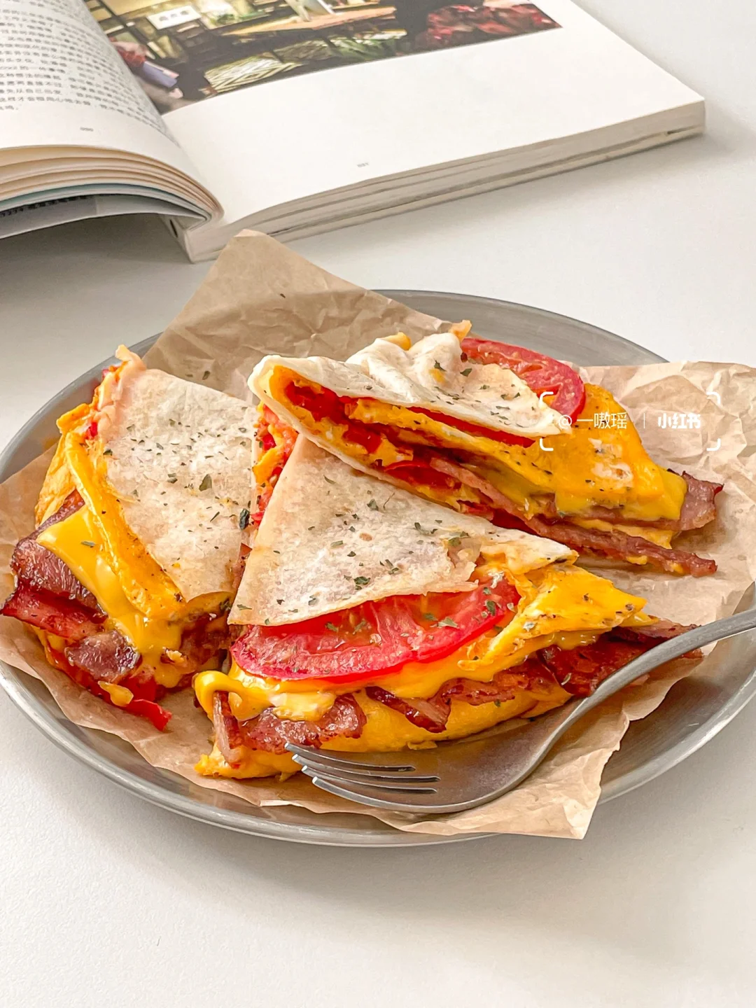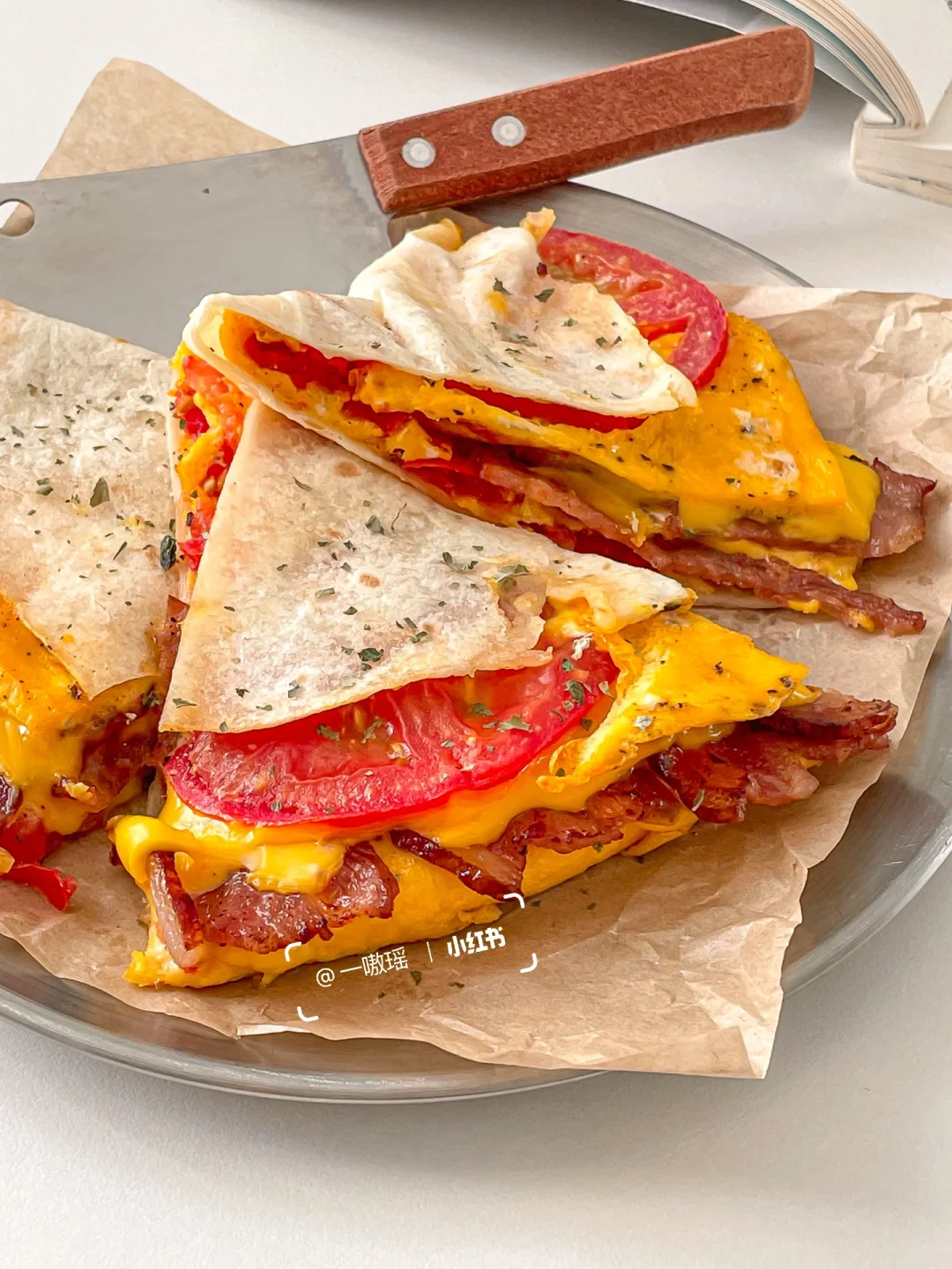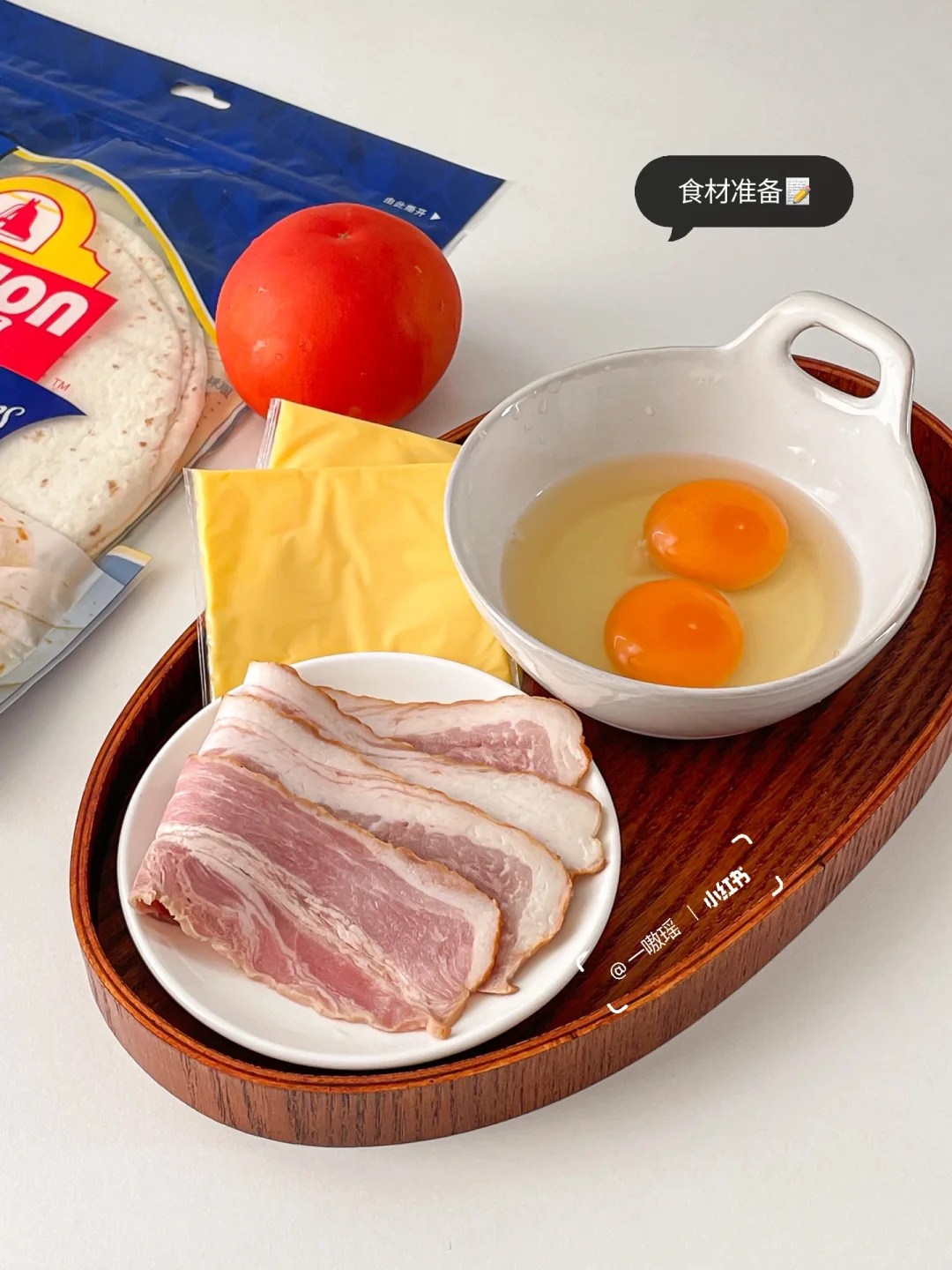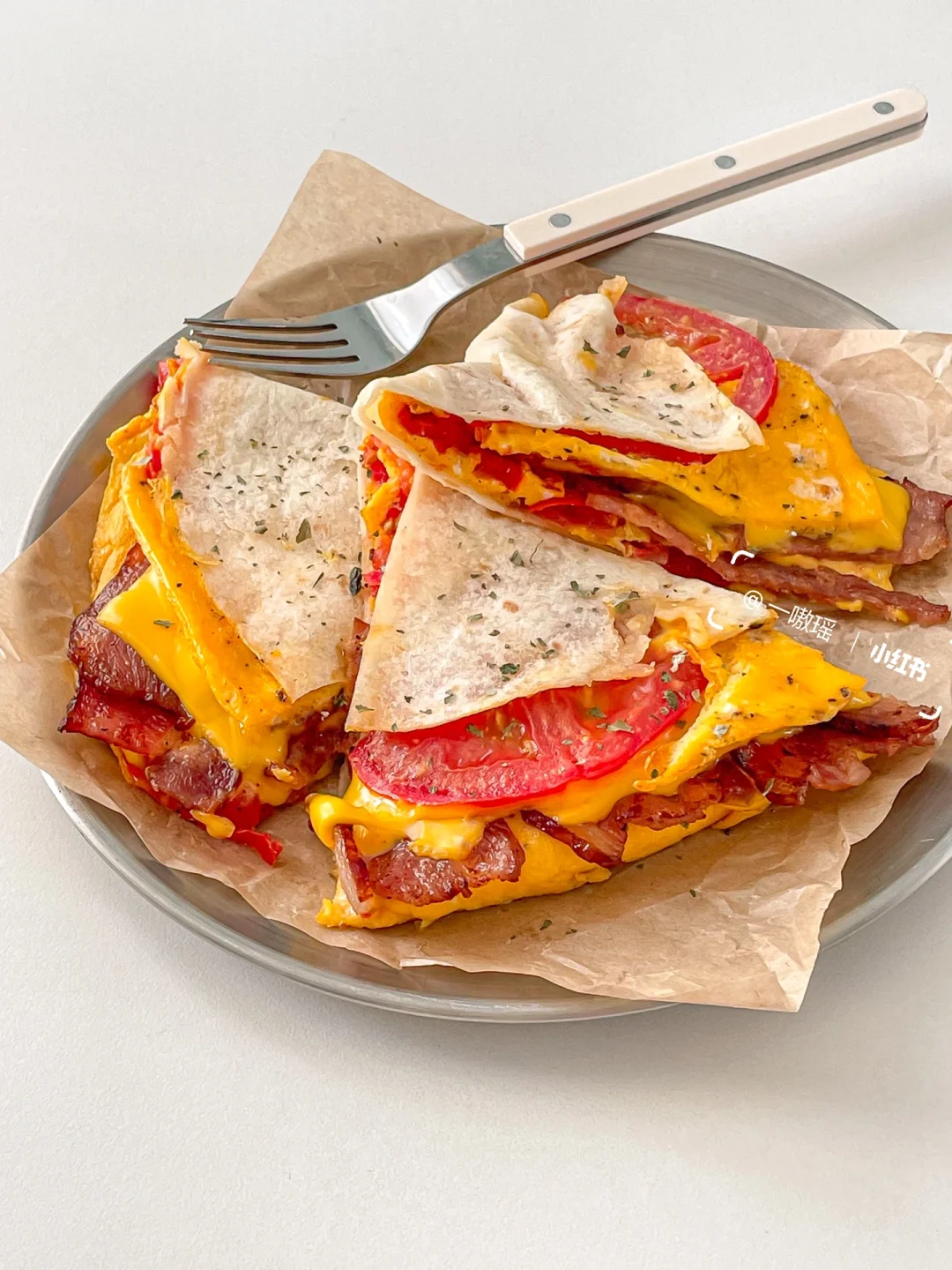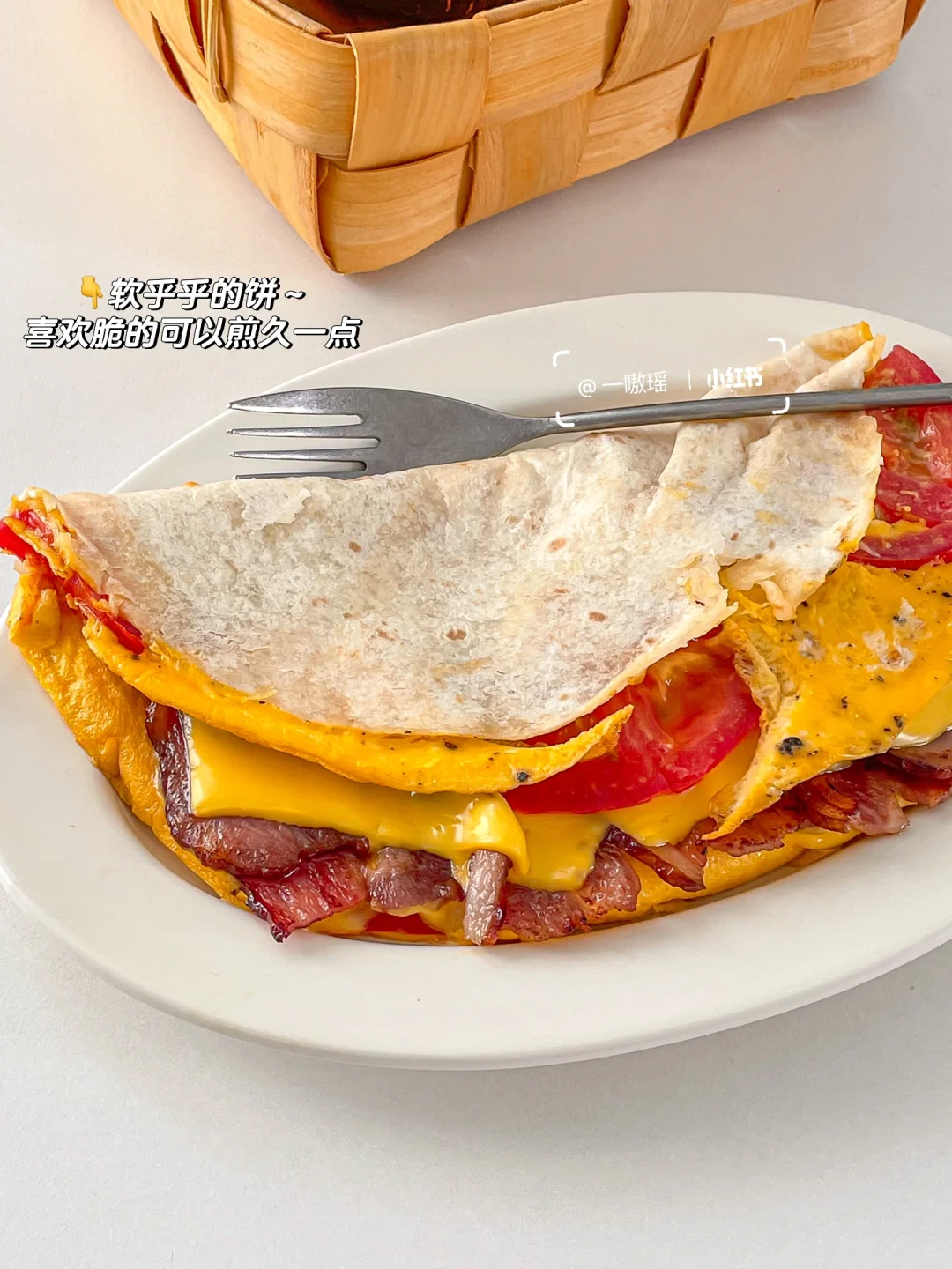 10分钟快手减脂早餐🍅🧀🥓 •̀֊•́ 零难度! 鲜香鲜香的, 每一种食材都贡献了独特风味 🍅&🍳新奇可爱的做法,好吃好看营养丰富!一定要试试! - 🛒食材 西红柿一个 鸡蛋两颗 培根三片 芝士片两片 卷饼一张 👩🏻‍🍳做法 1、番茄切片少油两面煎一下 2、鸡蛋加黑胡椒打散倒入煎至定型 3、盖上卷饼压实,借助盘子翻面转小火 4、铺上芝士片,煎熟的培根片,再放一片芝士 5、对折煎至芝士融化 - 🔴 ▫️煎制培根无需倒油 ▫️翻面的时候扣上盘子,按住,翻转锅 ▫️卷饼那面贴锅底全程小火 ▫️想吃脆的煎久一点,看到饼皮烘烤到上色是变脆的的过程