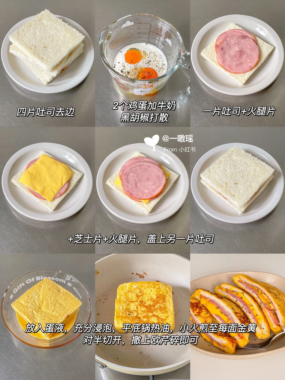 食材:四片吐司 火腿 两个鸡蛋 牛奶 两片芝士片