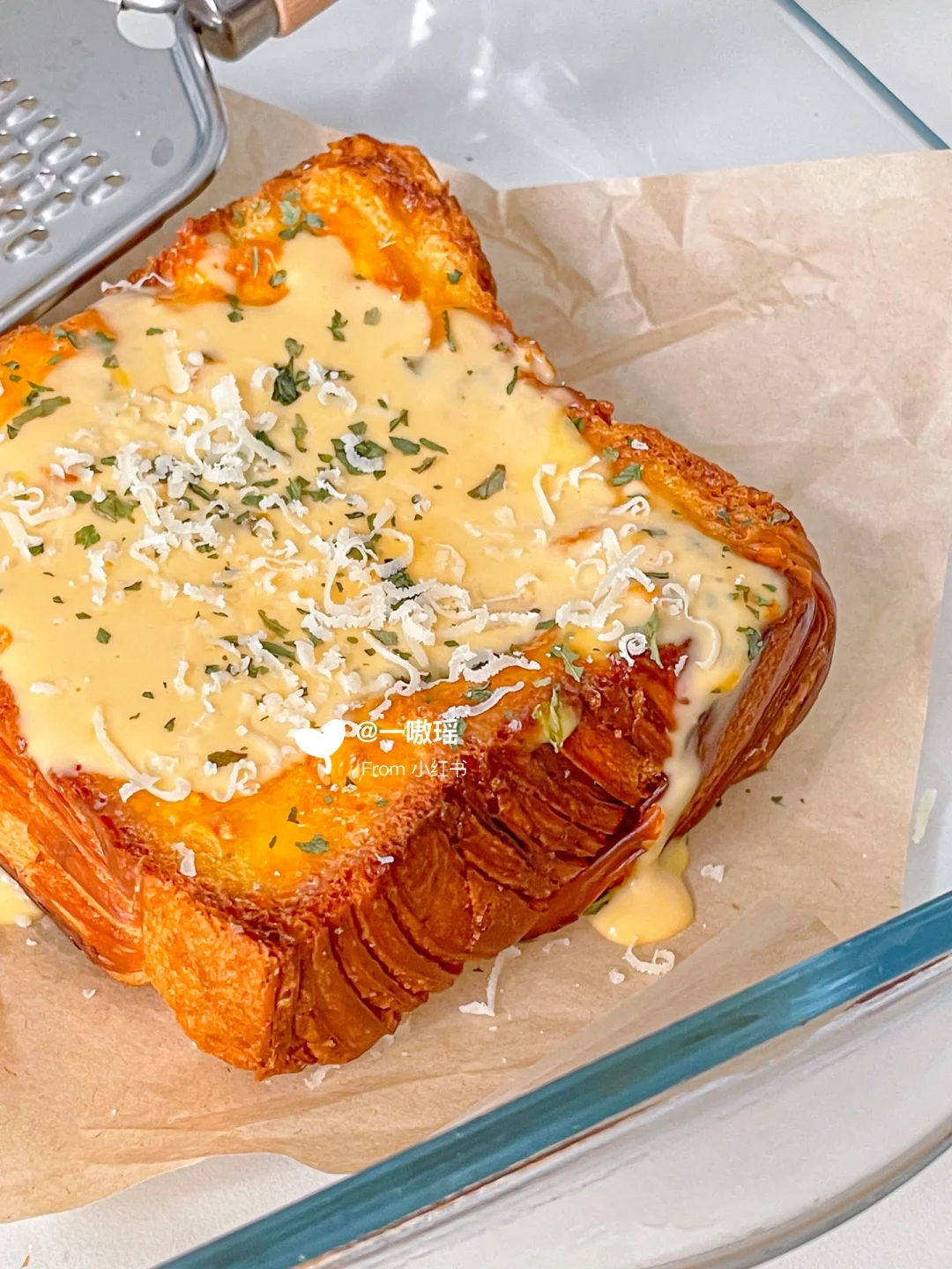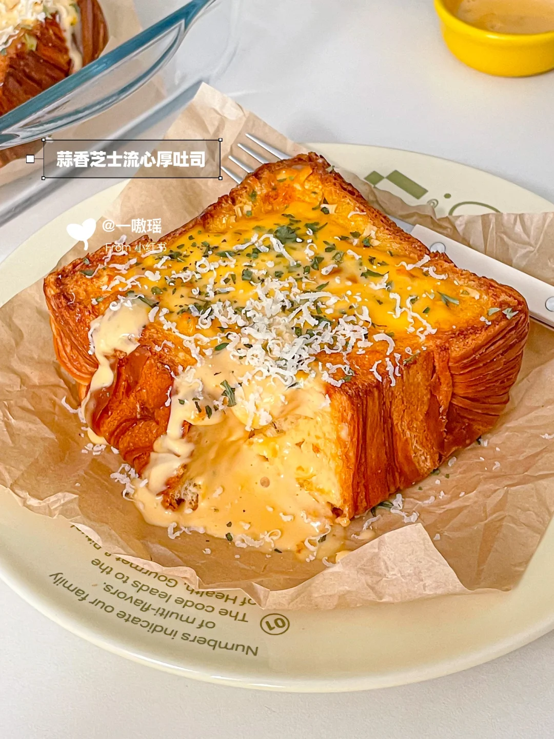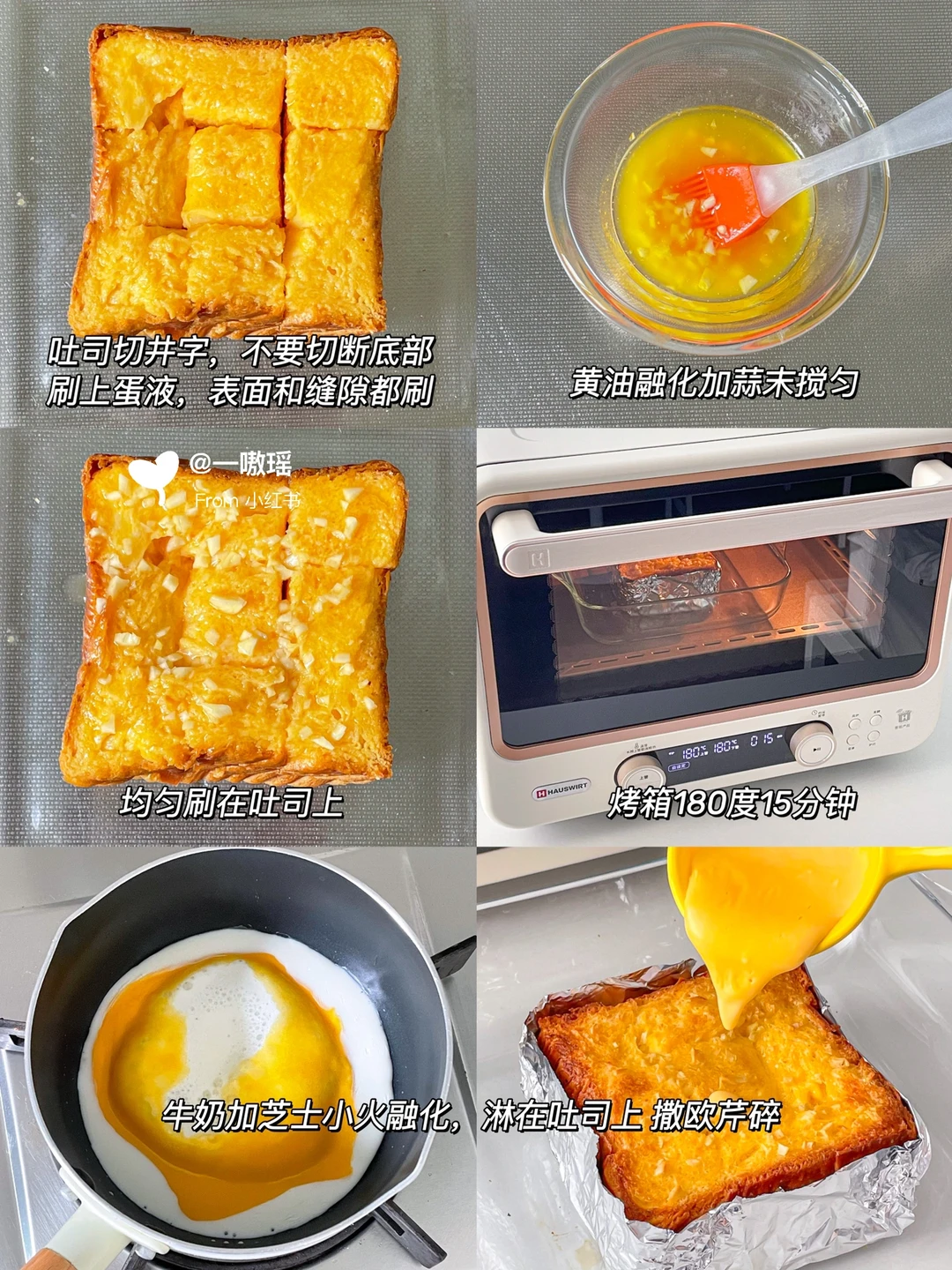 食材:厚吐司 黄油15g 蒜头两瓣 鸡蛋一个 芝士片一片 牛奶45g