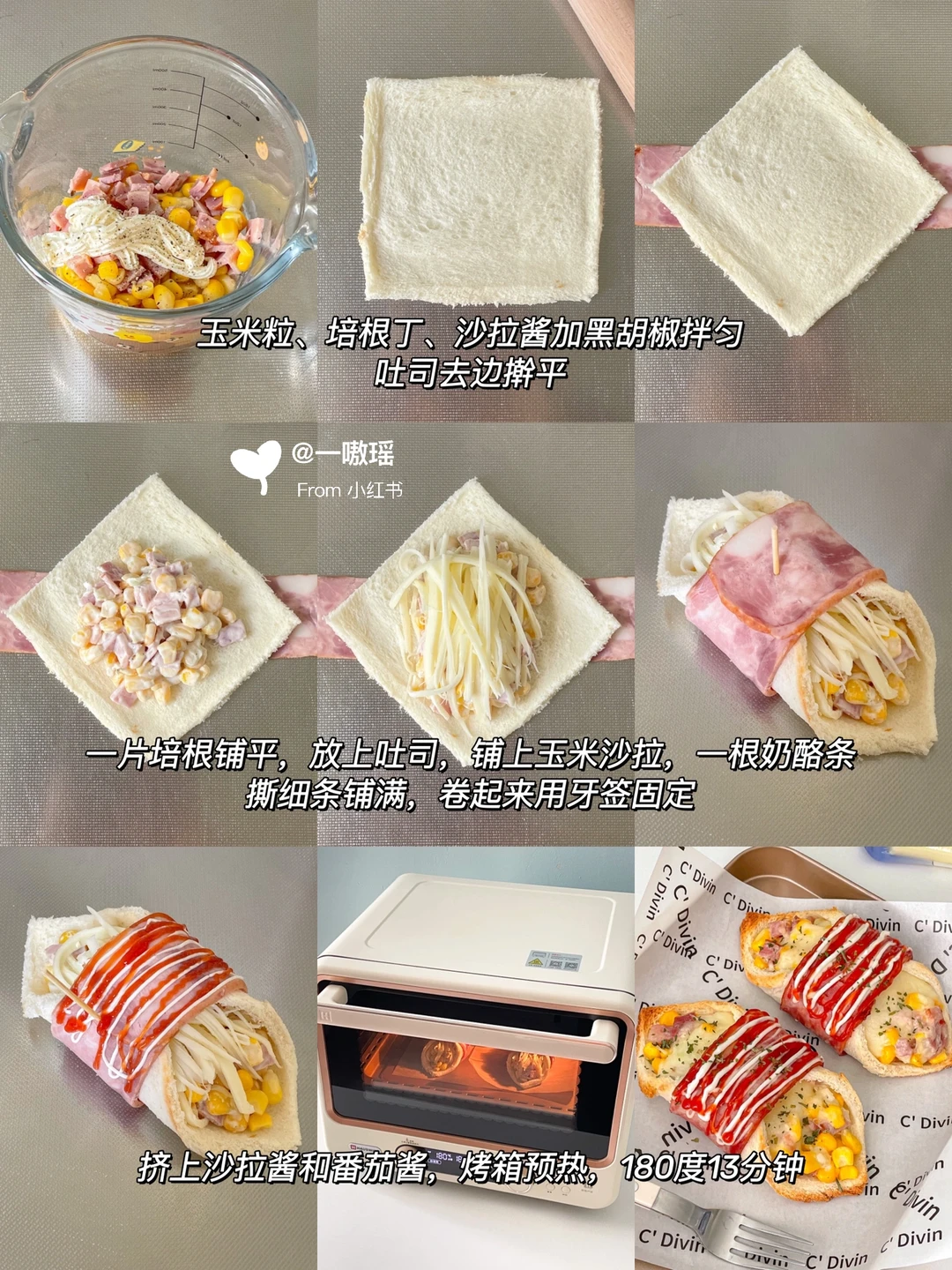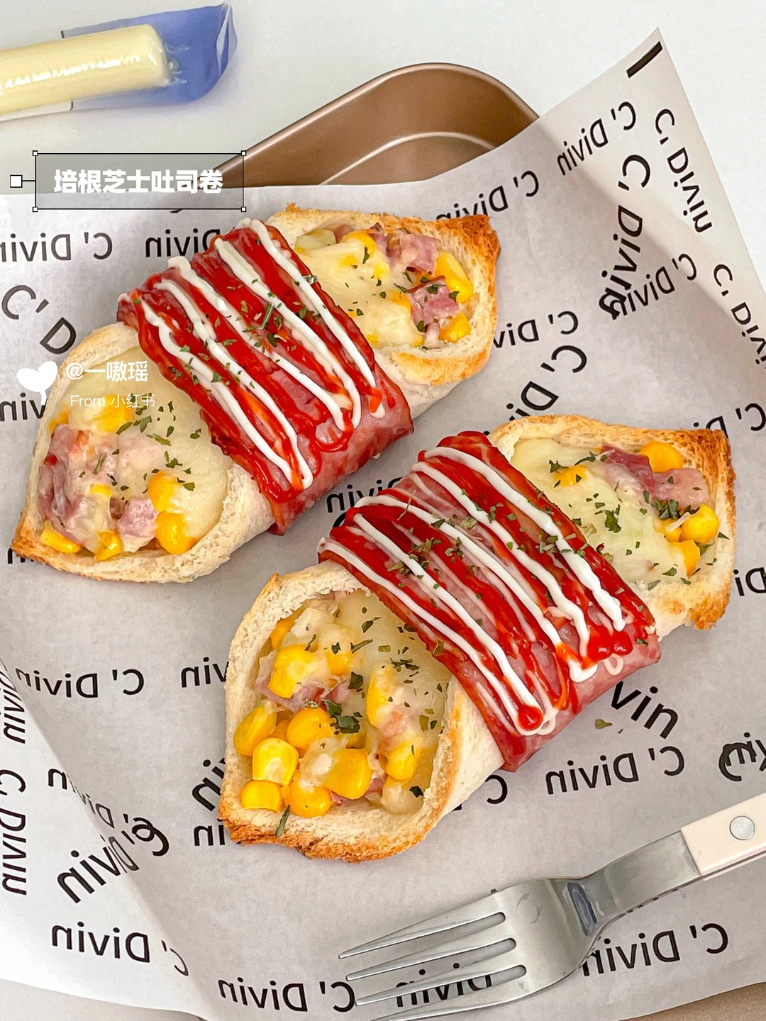 食材:吐司2片 培根3片 玉米粒 奶酪棒2根 沙拉酱 番茄酱 黑胡椒 欧芹碎(没有可不加)