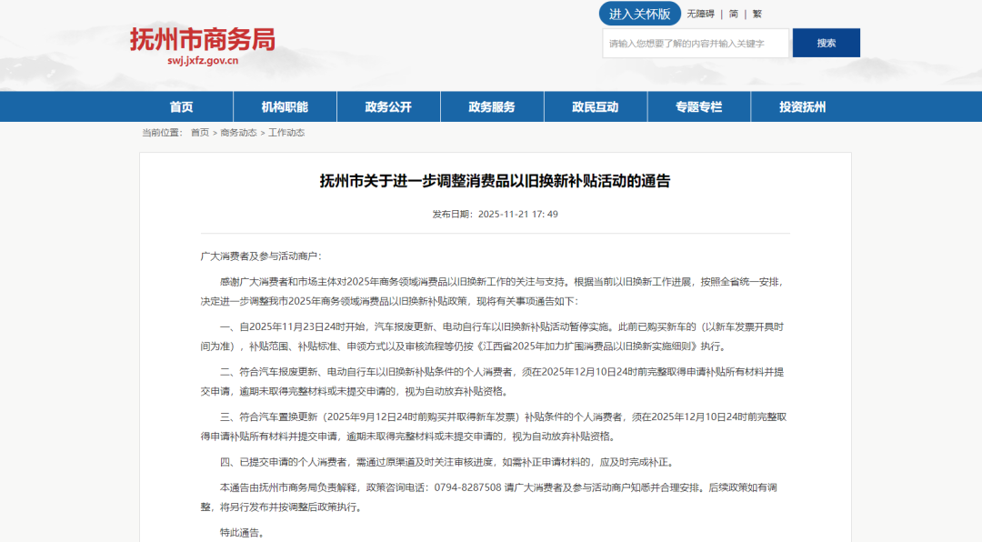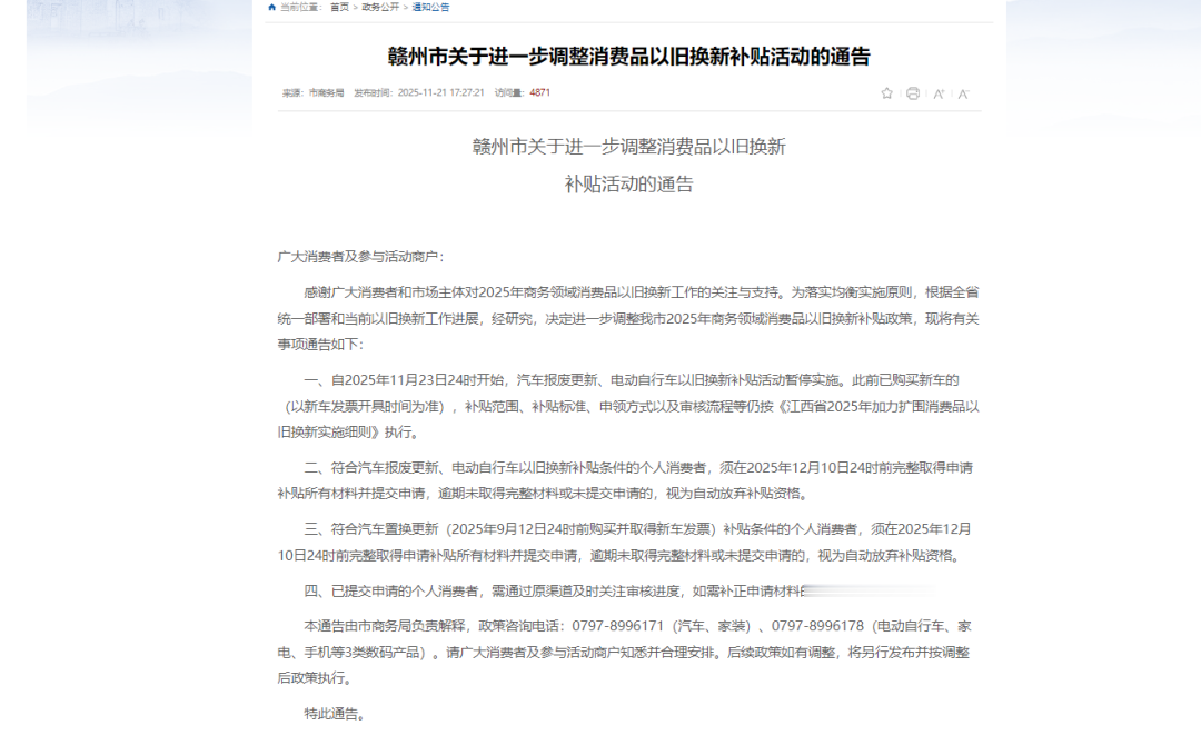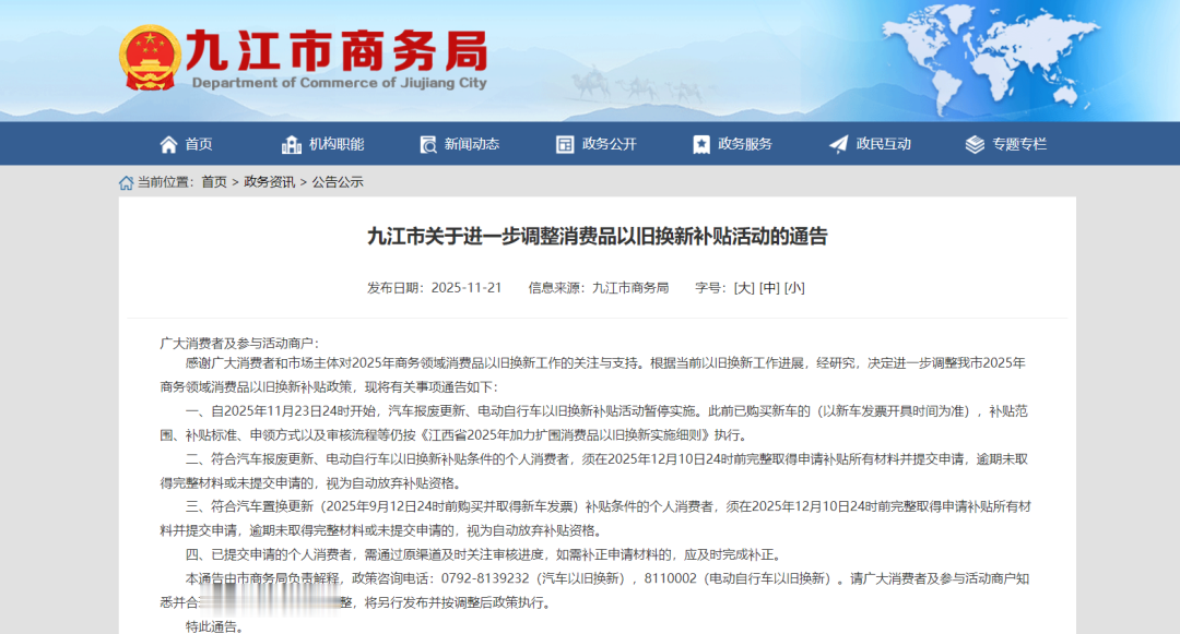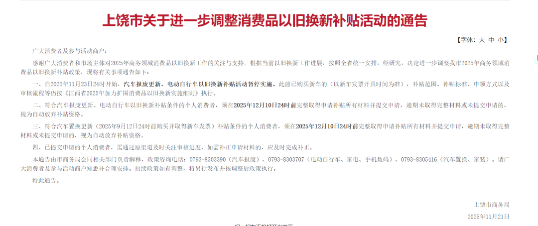 一、自2025年11月23日24时开始,汽车报废更新、电动自行车以旧换新补贴活动暂停实施。此前已购买新车的(以新车发票开具时间为准),补贴范围、补贴标准、申领方式以及审核流程等仍按《江西省2025年加力扩围消费品以旧换新实施细则》执行。