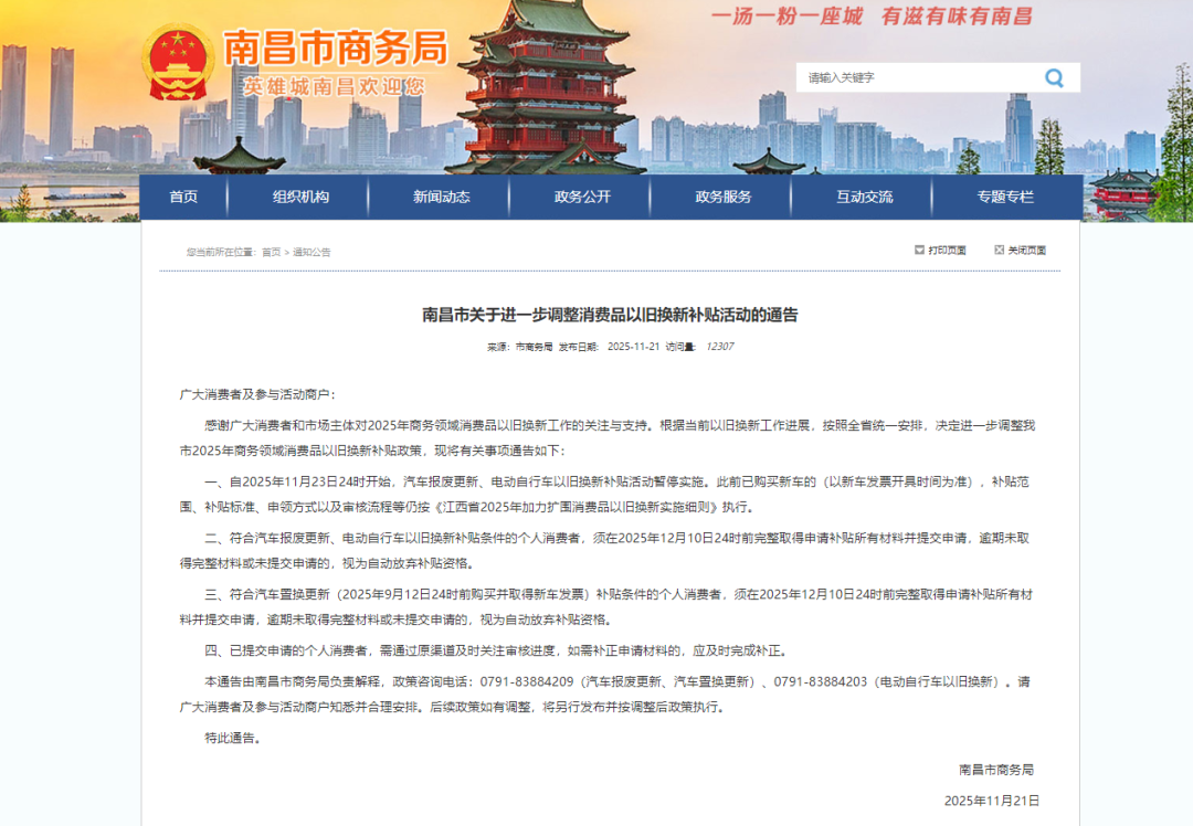 南昌市关于进一步调整消费品以旧换新补贴活动的通告