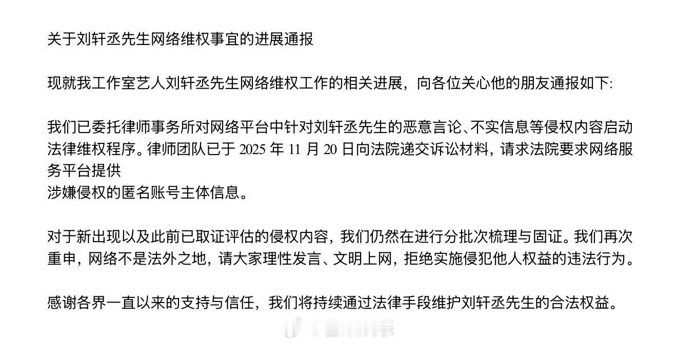 刘轩丞工作室更新维权进展通报,支持维护刘轩丞 合 法 权 益