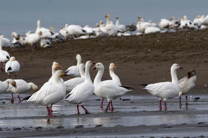这是11月8日在加拿大里士满艾奥纳海滩拍摄的雪雁。每年秋季,大批雪雁从北方迁徙至加拿大不列颠哥伦比亚省南部与美国华盛顿州停歇觅食,随后再飞往南方越冬。新华社发(梁森摄)