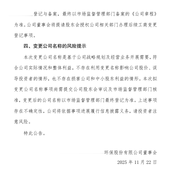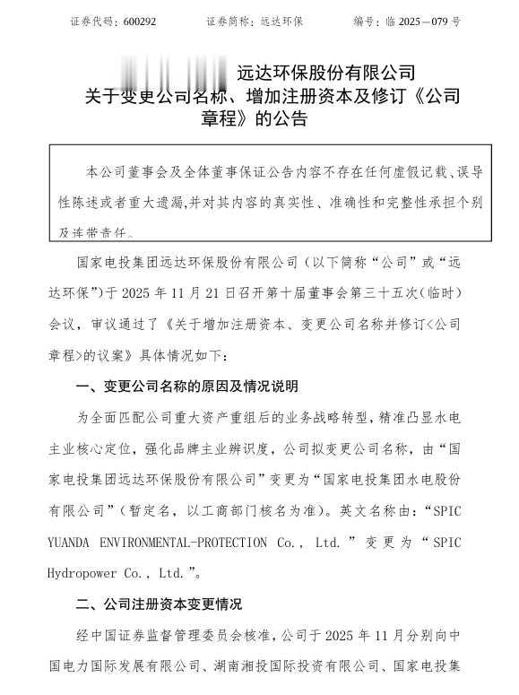 11月22日,远达环保发布公告称,公司于11月21日召开第十届董事会第三十五次(临时)会议,审议通过了《关于增加注册资本、变更公司名称并修订的议案》。为全面匹配公司重大资产重组后的业务战略转型,精准凸显水电主业核心定位,强化品牌主业辨识度,公司拟变更公司名称,由“国家电投集团远达环保股份有限公司”变更为“国家电投集团水电股份有限公司”(暂定名,以工商部门核名为准)。