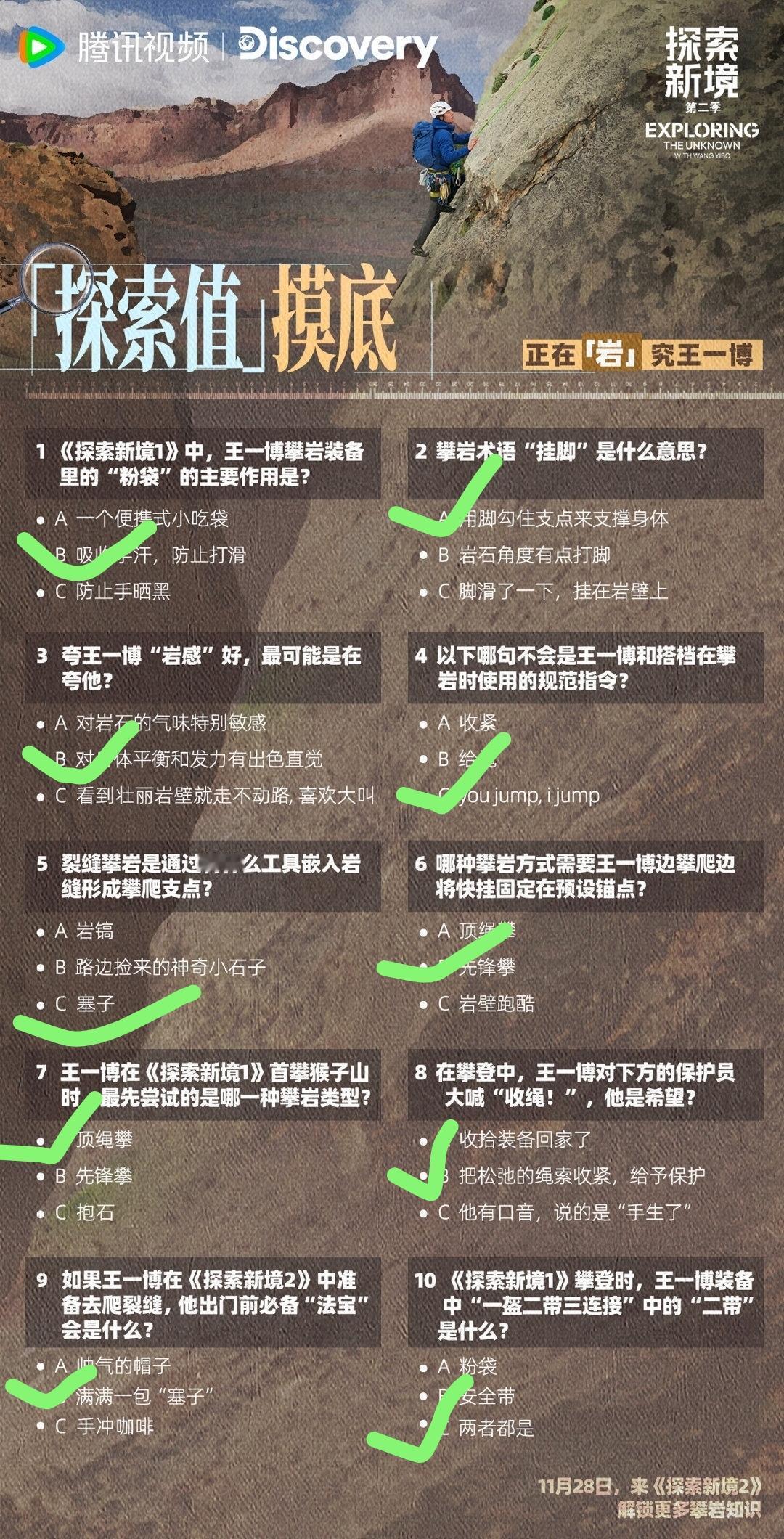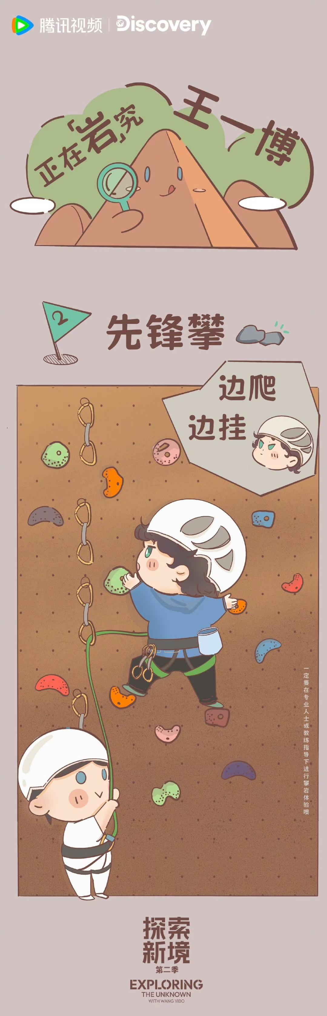来来来,跟着王一博作为发起人、11.28即将播出的个人ip户外探索纪实纪录片《探索新境2》学习攀岩🧗🏻♂️知识啦👏🏻👏🏻👏🏻。 Q弹Q弹鼓着奶膘的Q版啵啵来给科普啦,你知道什么是“顶绳攀”?什么是“先锋攀”?什么是“抱石”吗? 最后再来答个题[偷笑]验收下大家看《探索新境》系列的“学习成果”吧,你能打几分?有没有大神给判个卷子?[思考] 王一博
