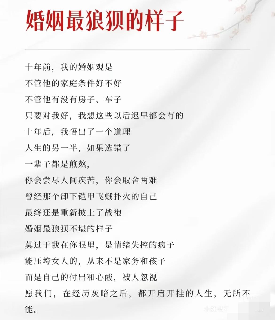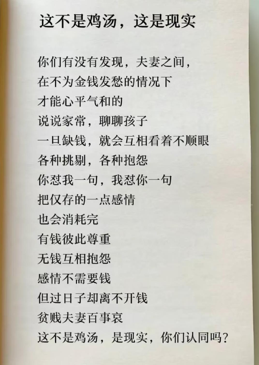 婚姻不需要金钱的支撑,你认同吗?婚姻不需要金钱的支撑这句话适合热恋时期的小情侣,现在说这种话的人,说句比较粗俗的话,要么脑袋进水要么就是精神有问题[泪奔]。 并不是拜金主义,也不是利己主义。我现在40岁,不是家庭主妇,通过我身边的女性朋友的生活品质和精神状态,就明显可以看出,那些经济拮据的,家里两娃的,不敢换房,只是琢磨把二室变三室,衣服一年也不舍得买一件,吃饭买菜都精打细算,孩子玩具很少买,辅导班几乎不上,毕竟也好面子嘛,平时也很少聊关于钱有关的话题,她经常时不时的就会发发牢骚:诶,那有啥法啊,温饱解决就不错了,更别提买房了,我家那位好几月不开工资了,我再不上班,孩子都养不起了……,又说了一堆她老公这不行那不行,公婆也不行的种种,看着她满面愁容的样子,我觉得满身都是负能量,而且面色苍老的狠。 反观那些,家庭里经济基础不错的,父母双方有退休金,两口子又是事业单位的,孩子分别让老人帮忙看的,那小日子别提多滋润了,开着30-50万的车,经常出去聚会,约朋友,妈妈上瑜伽课,孩子上舞蹈课,妈妈做美容,孩子去练钢琴……女性朋友越活越年轻。而且,两口子从没有因为孩子学习啊,买房啊,吃喝拉撒生过气,想买啥买啥,买个学区房,眼睛都不眨一下。这就是金钱的强有力的回馈。 尤其是年轻的女孩们,我也曾经年轻过,那时候就想,找个喜欢的男孩,什么钱不钱的,钱就是王八蛋,我只要喜欢他就行了。 直到步入婚姻后,我原谅了甩我的前男友,曾经他嫌弃我是穷家女,这个事我都完全释怀了!因为,他也想让生活过的宽裕一点,他也想找个门当户对,负担小的过日子。 能够让婚姻稳步向前的法宝就是金钱,说个最直接的,人都是具有强烈的攀比性的,以后你会比较老公,房子,孩子,车子,工作等等,当然也有佛系的,但是,我身边这种佛系的基本都是不缺金钱的人。 我这个年龄,有出现婚外情的;有因为男人给不了富足的生活,选择离婚的;有因为老人不出钱不出力把儿媳妇挤兑走的…… 说到底,就是因为钱嘛,老人没钱帮不上忙,男人能力一般赚不到钱,女人只剩下埋怨抱怨一箩筐…… 最后一句套用的老话就是:金钱不是万能的,但是没有金钱是万万不能的!
