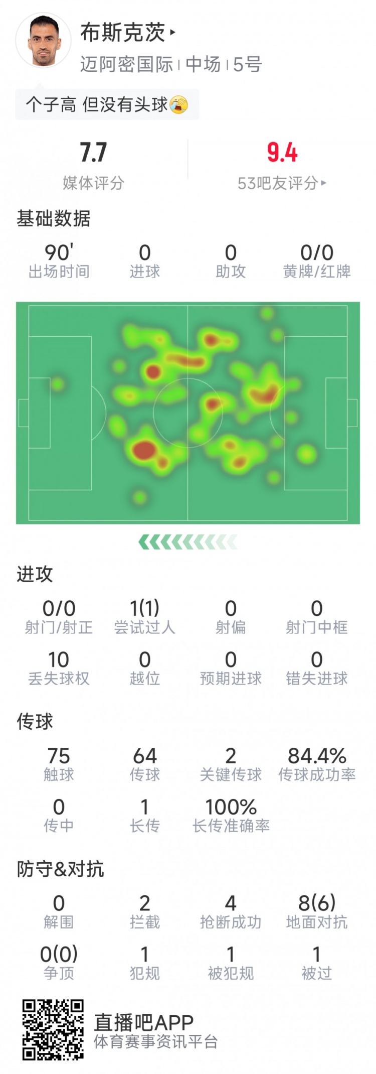 直播吧11月24日讯在美职联1/4决赛,迈阿密国际4-0大胜辛辛那提FC,以下为布斯克茨本场数据: