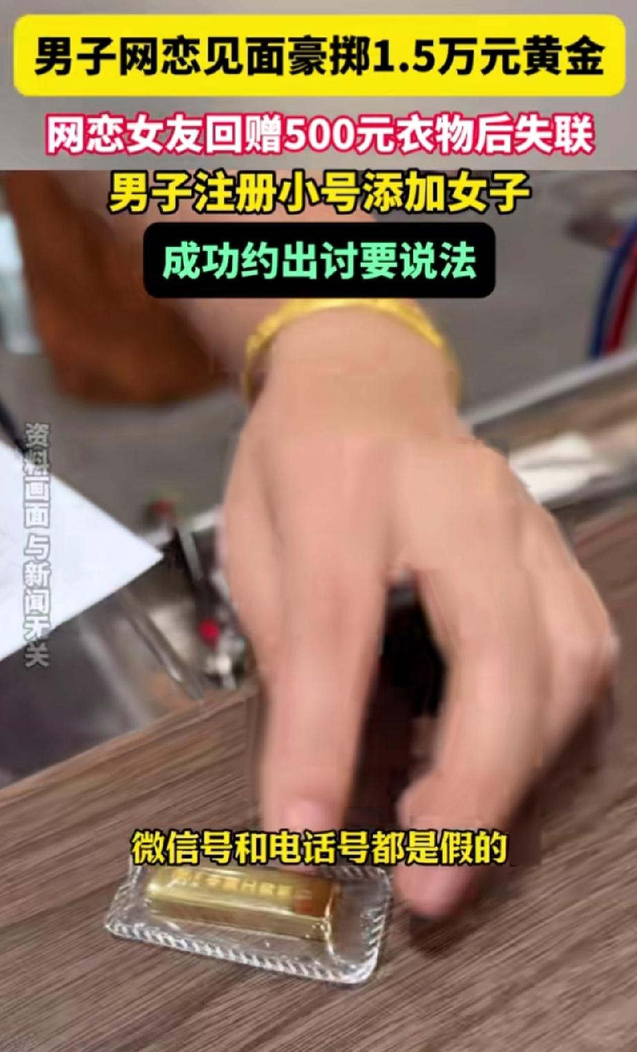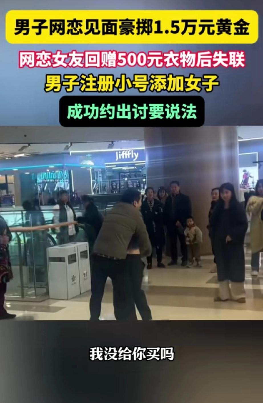 在四川成都,一名男子与女子网恋后初次见面,便花费1.5万为女友购置黄金首饰。不料,女子回家后,未作任何说明,便拉黑了男子的联系方式。 当天见面的时候,女友活泼又可爱,先主动给男子买了500元的衣物,说是定情。 随后把男子带到卖黄金的店里,要男子也给她买礼物。 男子已经陷入恋爱的幸福与甜蜜之中,便答应女友的请求,给她买了金手镯和金戒指。 当男子发现女友拉黑自己的时候,男子很诧异,百思不解。以为是自己哪里做得不够周到,但经朋友提醒,才意识到自己可能遭遇了骗局。 经过一番调查,男子发现女子的微信号和手机号登记的全是他人姓名。 男子不甘心被骗,便用其他手机号码添加了女子的联系方式,没有暴露身份,用其他名字假意与她继续谈恋爱,再次将女子约了出来。 见面后,女子一眼认出了男子,撒腿就想跑。男子一把搂住女子的腰,质问她:“为何骗我给你买黄金?” 女友不停的挣扎,急切的辩解道:“谁说我骗你了,我也给你买了500元的衣服。” 男子回到:“你的手机和微信号都是假的。” 女子还是不停的辩解,希望能够洗白,期望赶紧走掉,却被男子死死拉住。 围观的群众在了解真相后,也纷纷指责女子的行为。 初次见面就让对方买贵重物品,拿到手后便断了联系,这不是骗又是什么呢? 若不喜欢对方,没有眼缘,大可以直接说清楚,并归还贵重物品,这才是正确之举。 1.5万虽不算巨额,但也是普通打工人辛苦数月的工资,就这样被人轻易拿走,换作谁都不会乐意。 等价交换才是和谐相处之道,希望女子归还男子1.45万元,否则男子一旦报警,女子可能要承担诈骗的后果。 女性的底气,从来都是自食其力给的——不依附、不盲从、不骗取,靠自己挣来的生活,才最踏实滚烫。 来源:南昌晚报
