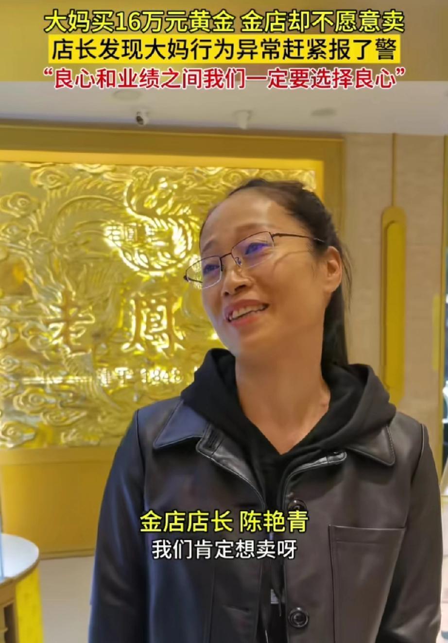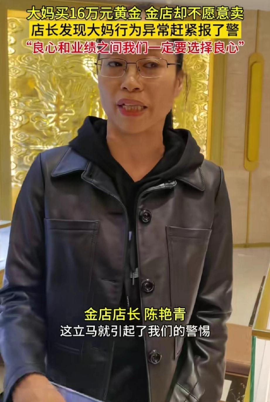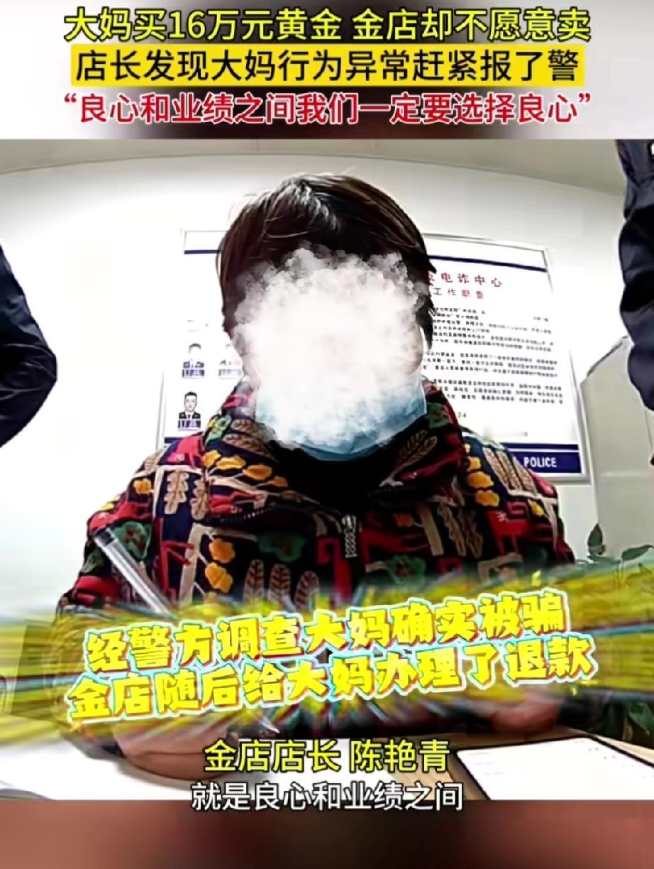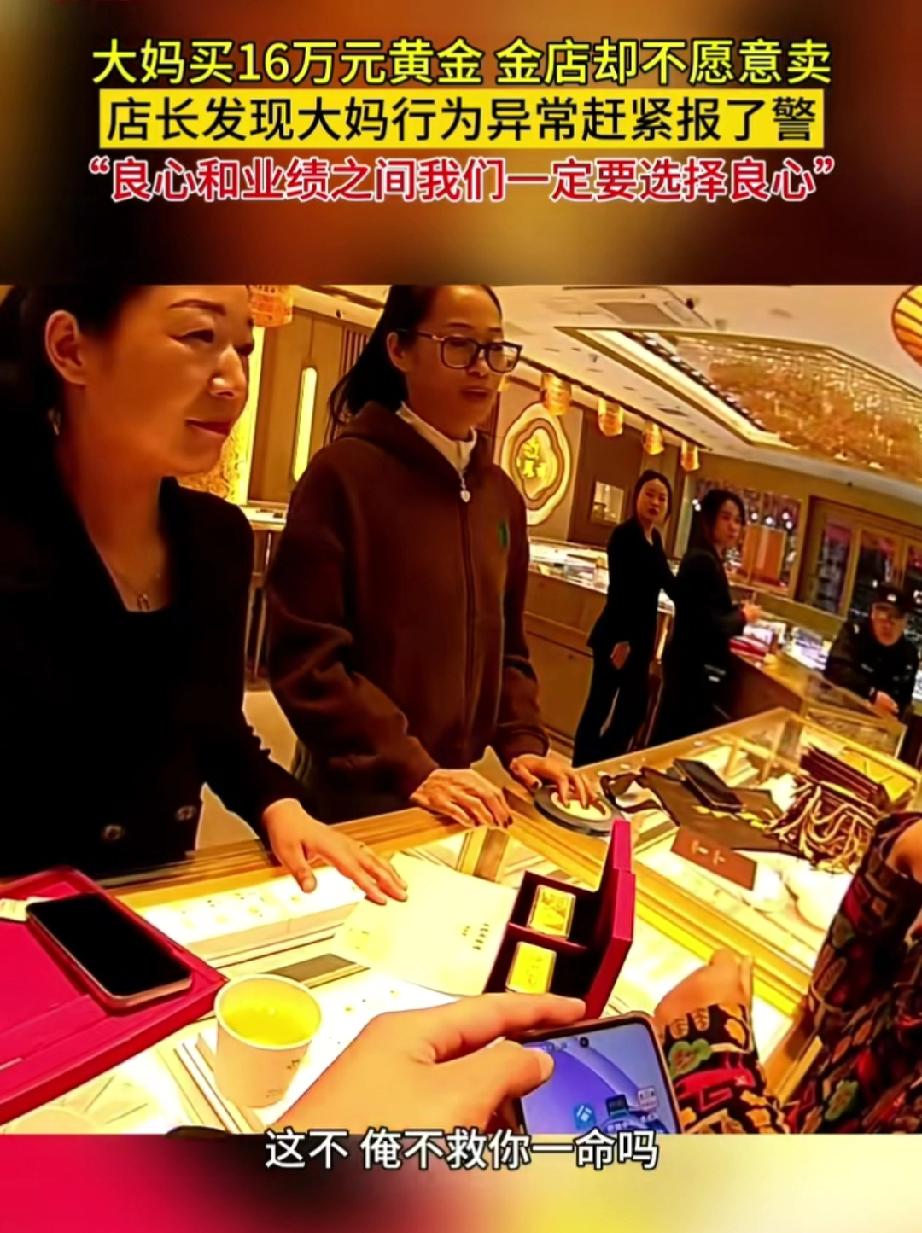 点赞好心人!在安徽淮北,一位大妈走进金店,表示要买200克黄金。这可是大客户,店员立刻通知了店长,店长赶忙出来接待大娘。 店长将黄金备好,付款时,大妈不会网上支付,便请店长帮忙。 店长发现大娘使用多张信用卡支付,多次尝试后,卡里再也刷不出钱了。 而大娘的钱只够买150克黄金,价值16万。 完成支付后,大娘的一句话引起了店长的警觉。大娘说:“你们把黄金包装严实点,等下我要邮走。” 店长询问:“您要把黄金邮给谁呢?”大娘回答:“一位网友。我帮他买黄金,他会给我报酬,到时候报酬和本金一起给我。” 店长一听,猜测大娘可能遭遇了诈骗,便一边劝阻大娘,一边报警。 店长对大娘说:“您遇到骗子了。” 可大娘坚信自己没遇到骗子。 店长又说:“您来买黄金,我得感谢您帮我提升业绩。要是您被骗了,我这不是救您一命嘛。” 大娘坐在那里沉默不语。这时,警察赶到,把大娘带到派出所了解情况,警察证实大娘确实遇到了骗子。 最终,店长退还了大娘的16万。 大娘的家人赶来后,对店长表达了深深的感激。 店长笑着说:“我们也想做成这笔生意,这样有业绩,但在业绩和良心之间,我们选择良心。” 宁愿不要抽成,也要维护大娘的利益,这位最美店长至善至美,难道不该为她点赞吗? 面对网友金钱往来的请求,再大的利益诱惑也请果断拒绝——守住钱袋子,才守住了稳稳的安全感,别为陌生关系去冒险。 来源:AHTV第一时间