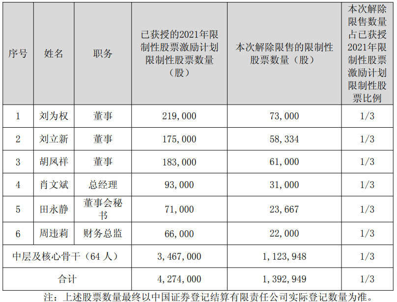 本次解除限售的股票数量为139万股,将于2025年12月1日上市流通。此次解除限售条件已满足,符合条件的激励对象共70名。具体表现如下: