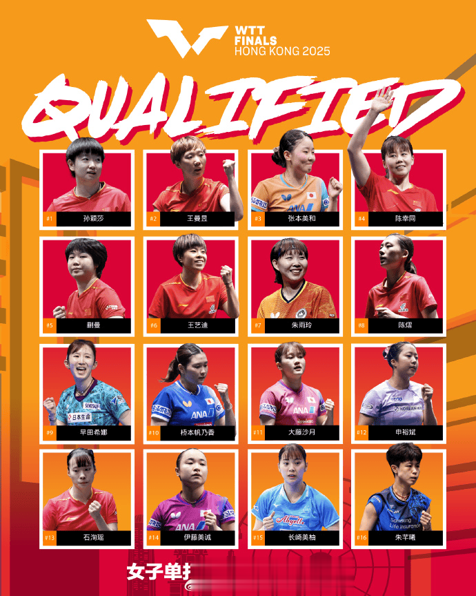 孙颖莎、王曼昱、张本美和、陈幸同、蒯曼、王艺迪、朱雨玲、陈熠、早田希娜、桥本帆乃香、大藤沙月、申裕斌、石洵瑶、伊藤美诚、长崎美柚、朱芊曦