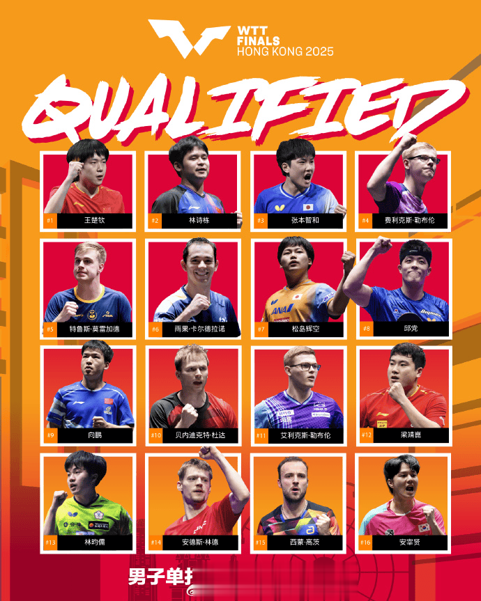 男单名单:王楚钦、林诗栋、张本智和、费利克斯-勒布伦、莫雷高德、雨果、松岛辉空、邱党、向鹏、杜达、艾利克斯-勒布伦、梁靖崑、林昀儒、安德斯-林德、西蒙-高茨、安宰贤