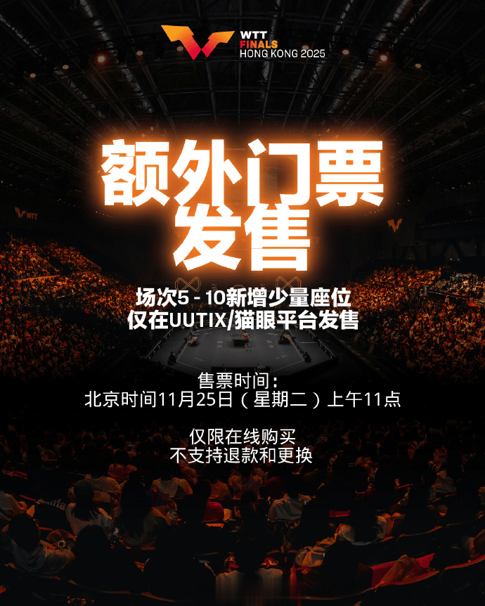 虎扑11月24日讯WTT世界乒联宣布:限量加开场次5至场次10门票,额外门票将于北京时间11月25日(星期二)上午11:00,在相关平台发售。并更新了参赛名单。