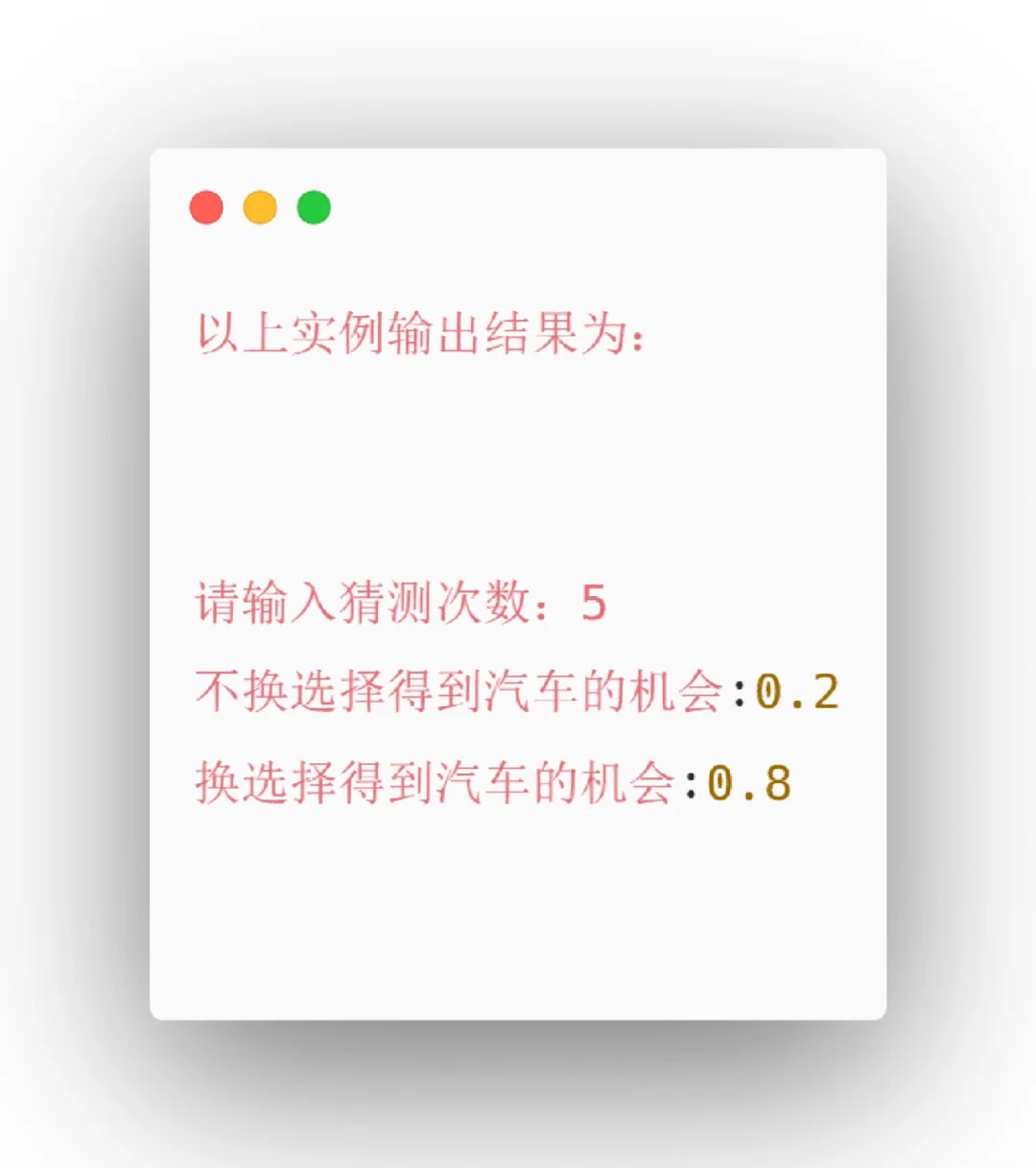 参赛者可以选择一扇门,在开启它之前,主持人会开启另外一扇门,露出门后的山羊,然后允许参赛者更换自己的选择。输出不换和换情况下得到汽车的概率,保留一位小数。