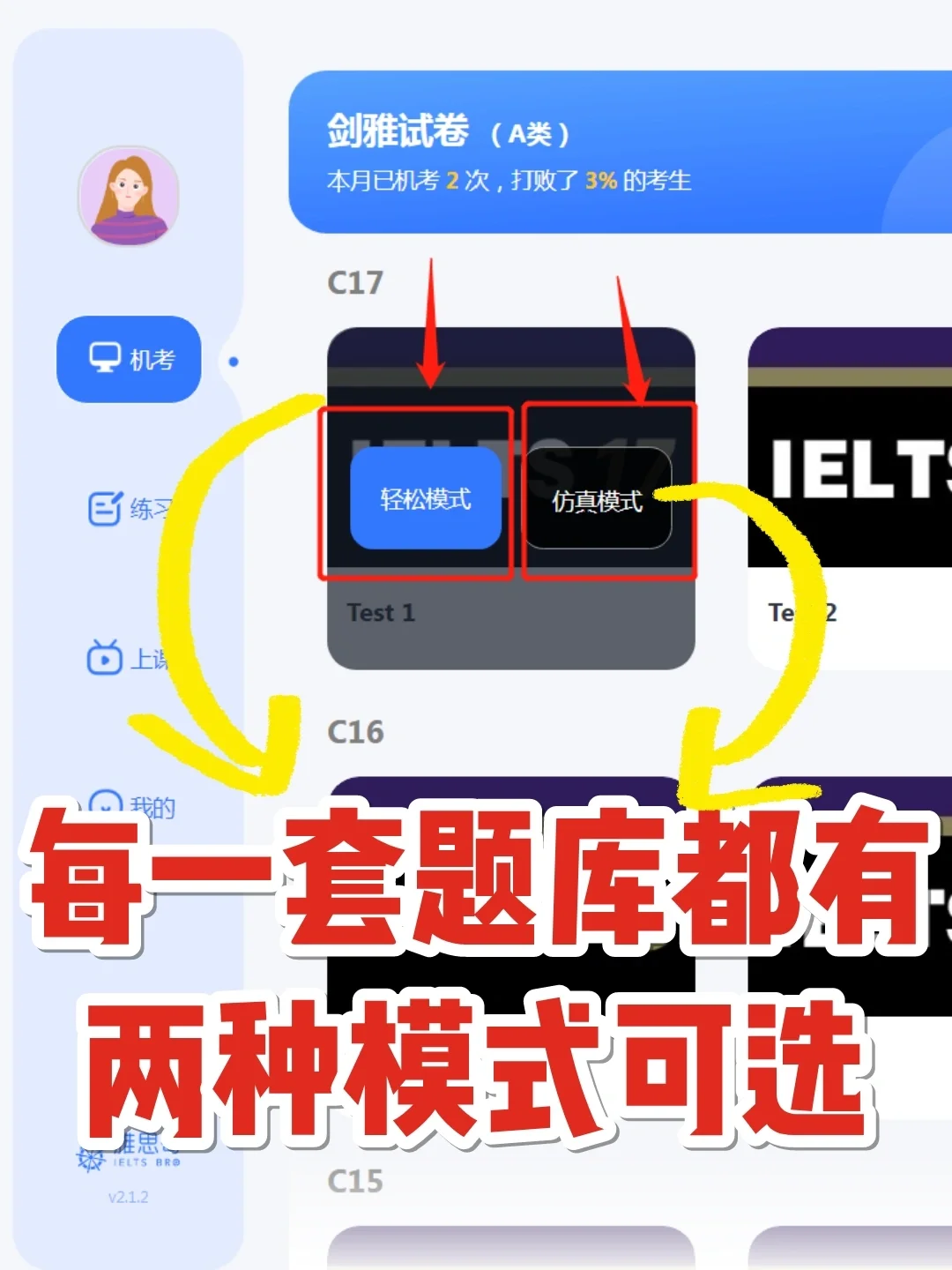 图[三R]:每一套题库都有两种刷题模式(轻松模式和高仿真模式)。
