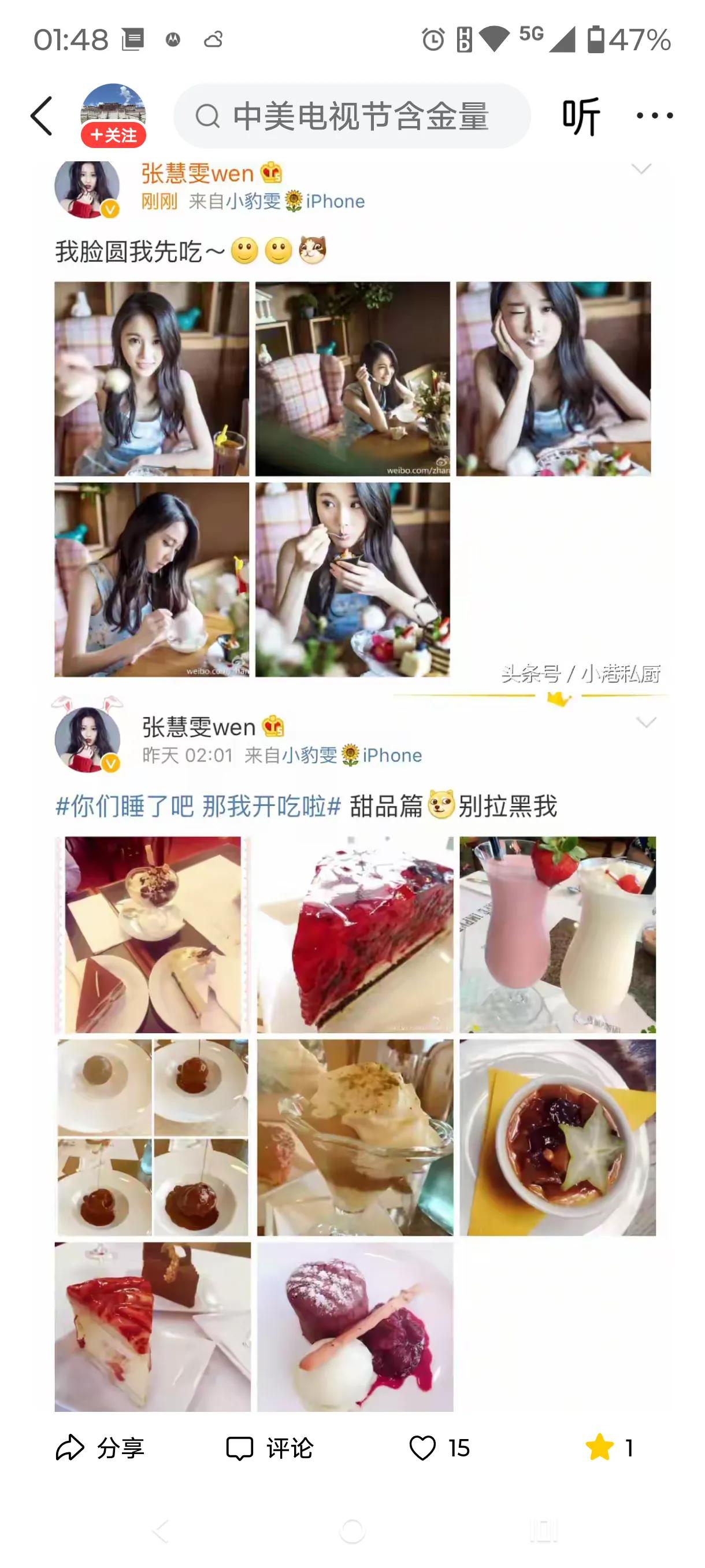 别的女明星连正餐都在计算卡路里,控制食量,张慧雯在片场吃零食,吃道具蛋糕的样子被拍成了花絮。[大笑] 她这纯真的个性,像极了我们年轻时的自己,或是身边的某一个闺蜜。